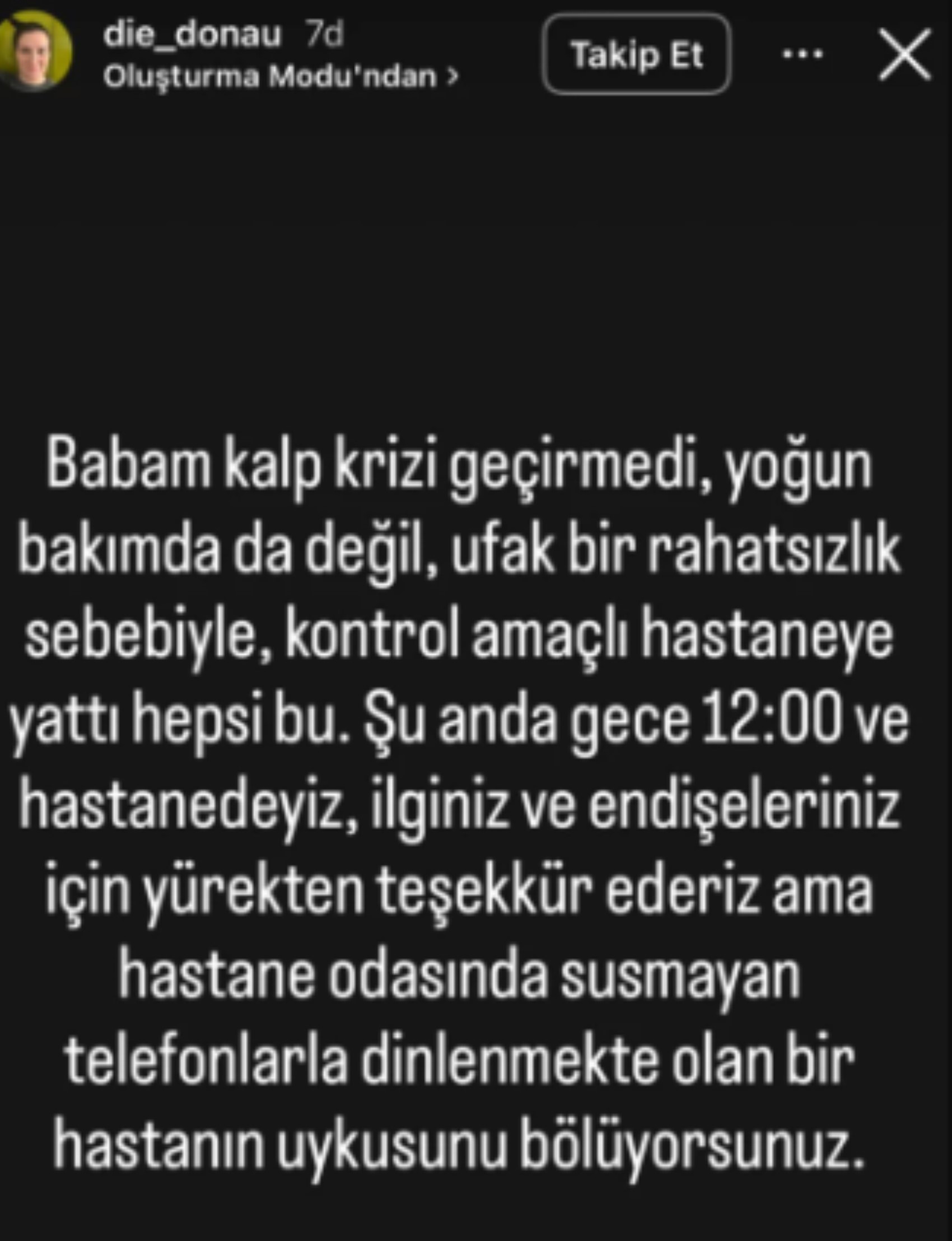 Tuna Ortaylı Kazıcı şu ifadeleri kullandı, “Babam kalp krizi geçirmedi, yoğun bakımda da değil, ufak bir rahatsızlık sebebiyle, kontrol amaçlı hastaneye yattı hepsi bu. Şu anda gece 12:00 ve hastanedeyiz, ilginiz ve endişeleriniz için yürekten teşekkür ederiz ama hastane odasında susmayan telefonlarla dinlenmekte olan bir hastanın uykusunu bölüyorsunuz.”