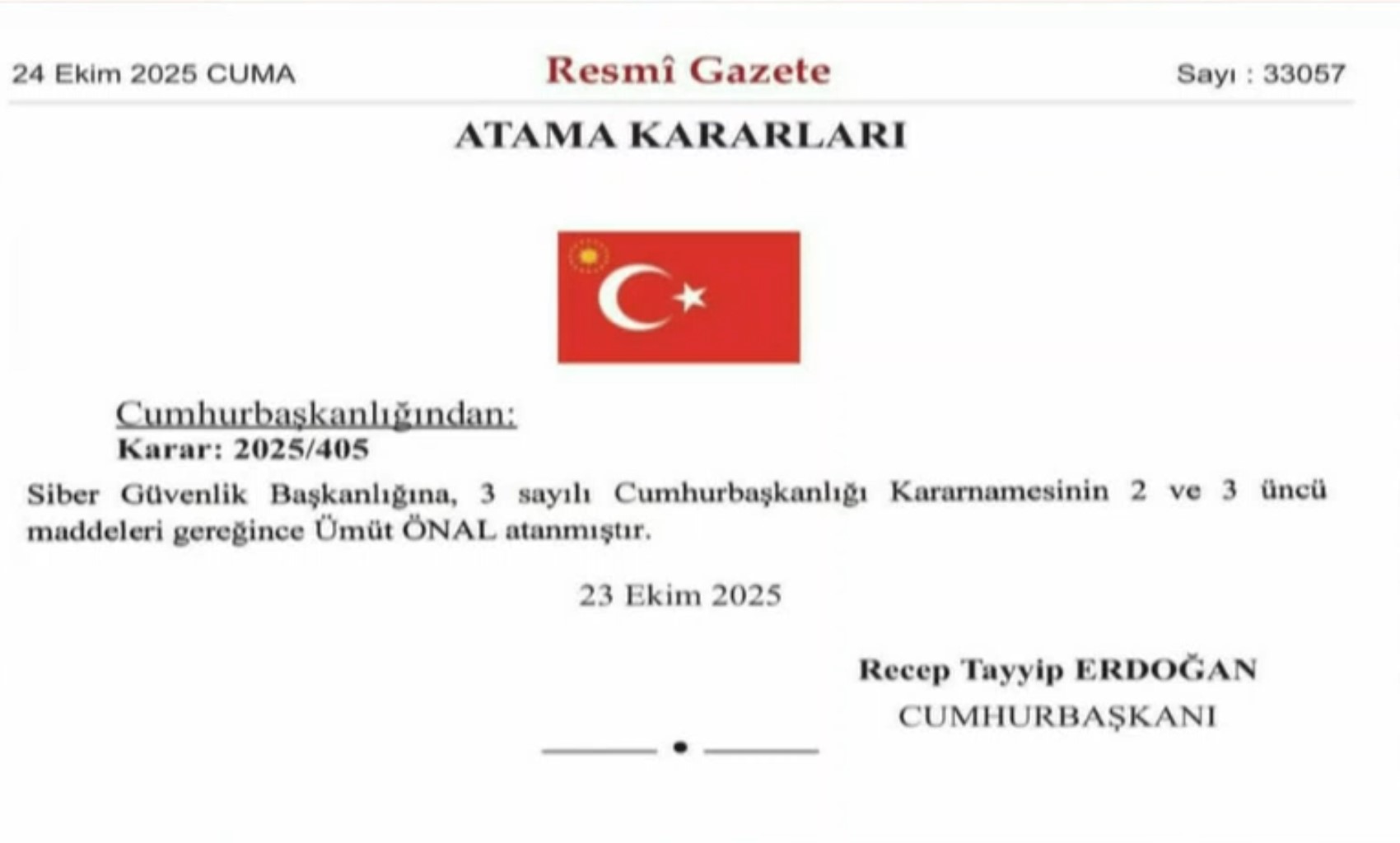 Cumhurbaşkanı Recep Tayyip Erdoğan’ın imzası ile Resmi Gazete’de yayımlanan karar ile birlikte, Siber Güvenlik Başkanlığı'na 3 sayılı Cumhurbaşkanlığı Kararnamesinin 2 ve 3’üncü maddeleri gereğince Ümit Önal atandı. Ayrıca karar ile birlikte Devlet Arşivleri Başkanlığı'nda açık bulunan Başkan Yardımcılığına Muhammed Hüseyin Karabul atandı. Sayıştay Savcılığına ise Davut Öksüz getirildi.