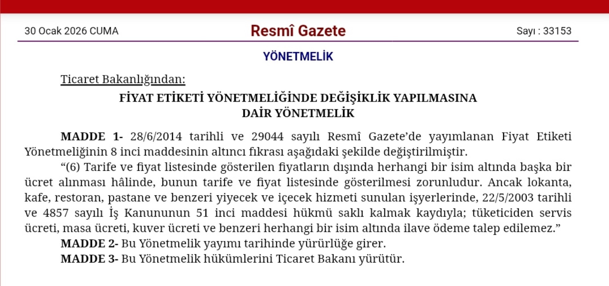 "Tarife ve fiyat listesinde gösterilen fiyatların dışında herhangi bir isim altında başka bir ücret alınması hâlinde, bunun tarife ve fiyat listesinde gösterilmesi zorunludur. Ancak lokanta, kafe, restoran, pastane ve benzeri yiyecek ve içecek hizmeti sunulan işyerlerinde, 22/5/2003 tarihli ve 4857 sayılı İş Kanununun 51 inci maddesi hükmü saklı kalmak kaydıyla; tüketiciden servis ücreti, masa ücreti, kuver ücreti ve benzeri herhangi bir isim altında ilave ödeme talep edilemez.”