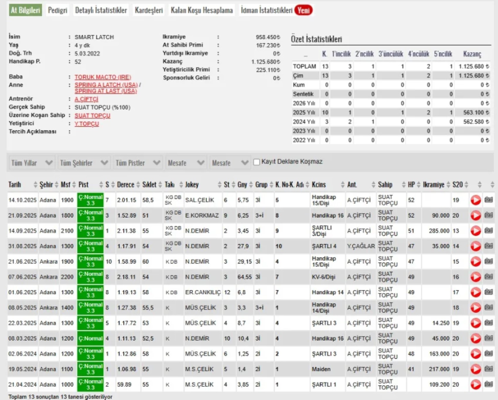 Yapılan incelemelerde, kavurmadaki etin Adana Yeşiloba Hipodromu’nda koşmuş Smart Latch adlı yarış atına ait olduğu tespit edildi. Üç birinciliği bulunan at, ilk yarışına 21 Nisan 2024’te Adana Hipodromu’nda çıktı ve yarışı ikincilikle tamamladı. Daha sonra katıldığı iki koşuyu kazandı. Son yarışına ise 14 Ekim 2025’te çıktı ve yarışı yedinci sırada bitirdi.