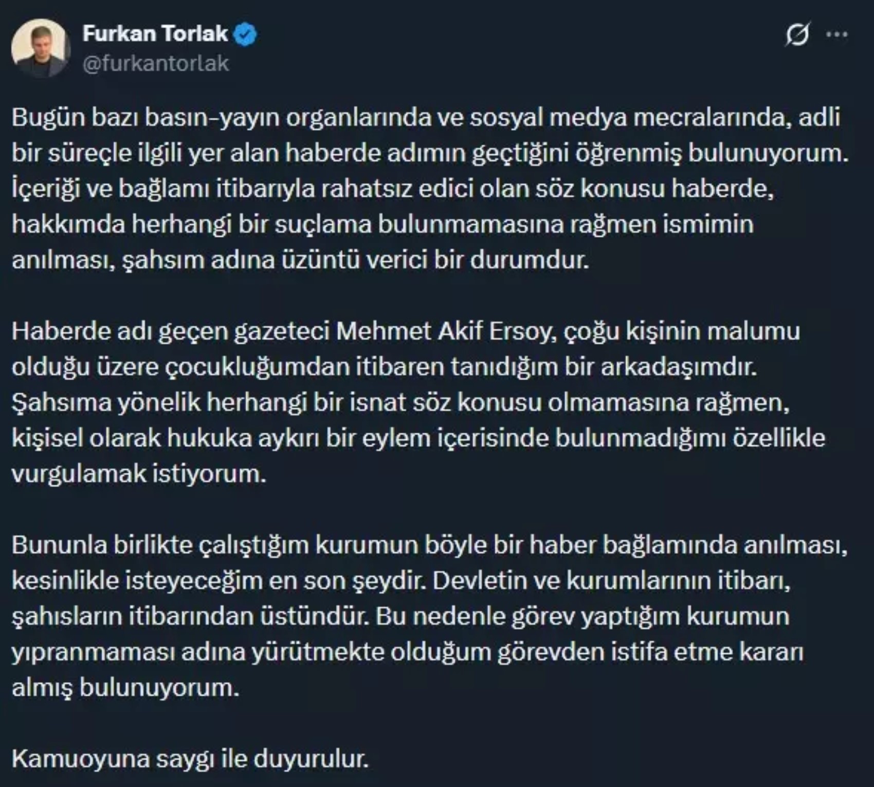 Torlak Sabah’ın haberinin ardından yaptığı açıklama ile görevinden istifa ettiğini şu sözlerle duyurmuştu: