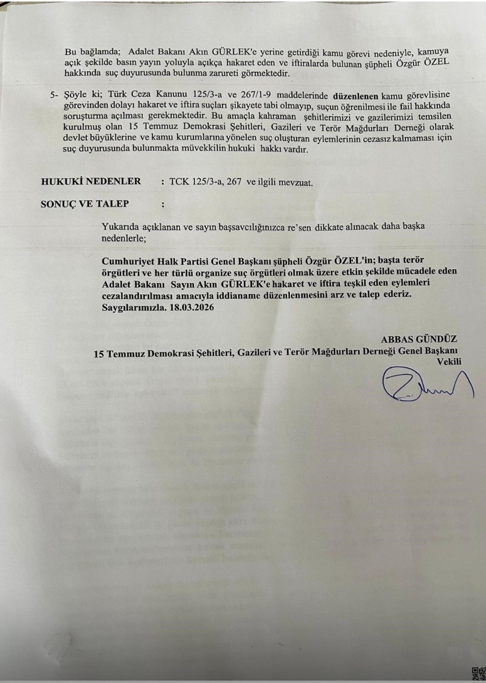 CHP Genel Başkanı Özgür Özel'in Adalet Bakanı Akın Gürlek'i hedef alan açıklamalarının ardından harekete geçen şehit yakınları ve gaziler adına suç duyurusunu Terör Gazisi, 15 Temmuz Demokrasi Şehitleri, Gazileri ve Terör Mağdurları Derneği Genel Başkanı Abbas Gündüz yaptı.