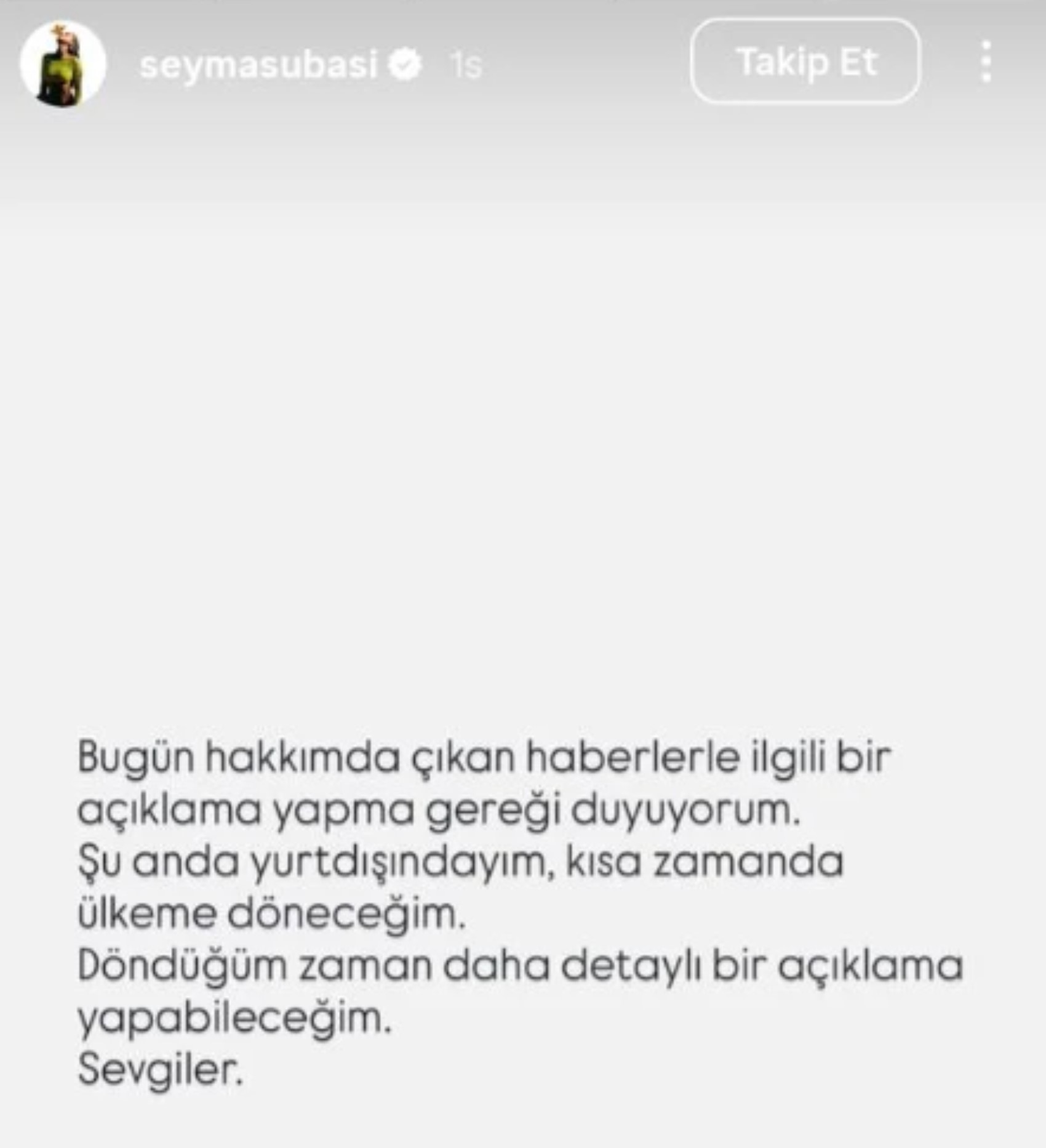 "Hakkımda çıkan haberlerle ilgili bir açıklama yapma gereği duyuyorum. Şu anda yurt dışındayım, kısa zamanda ülkeme döneceğim. Döndüğüm zaman daha detaylı bir açıklama yapabileceğim. Sevgiler…"