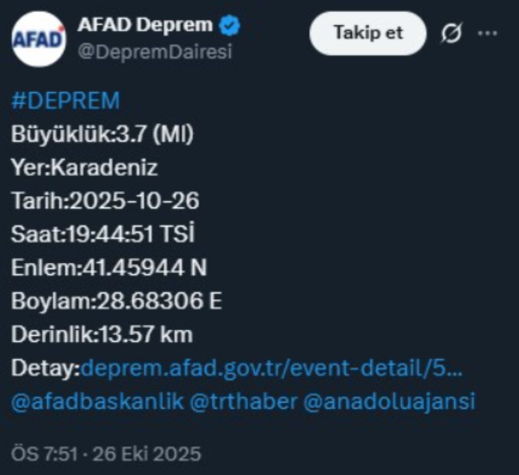 Karadeniz'de meydana gelen 3,7 büyüklüğündeki deprem, İstanbul başta olmak üzere birçok ilde hissedildi. Depremin derinliği 13,57 kilometre olarak ölçüldü.