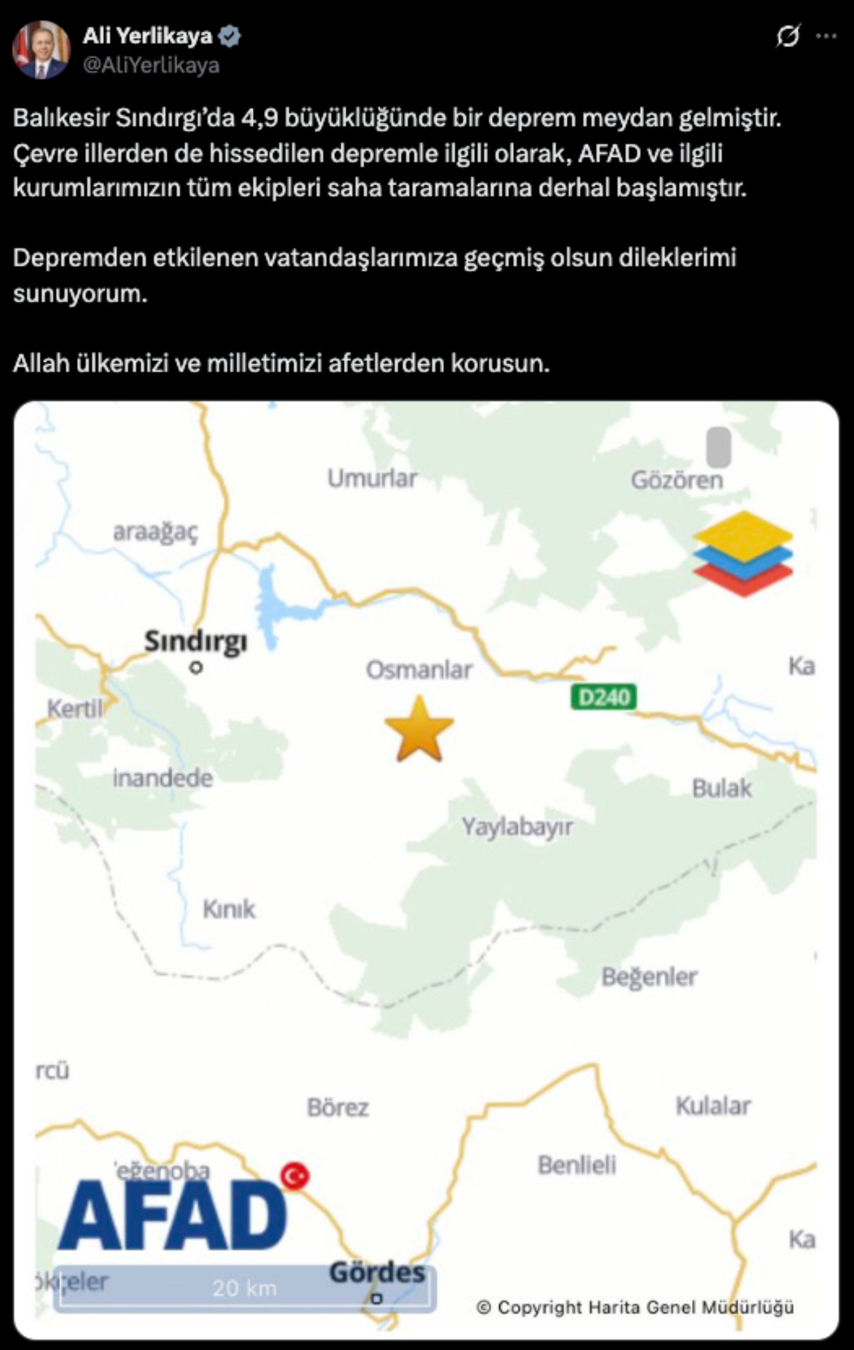 İçişleri Bakanı Ali Yerlikaya depremin ardından, "Balıkesir Sındırgı’da 4,9 büyüklüğünde bir deprem meydan gelmiştir. Çevre illerden de hissedilen depremle ilgili olarak, AFAD ve ilgili kurumlarımızın tüm ekipleri saha taramalarına derhal başlamıştır. Depremden etkilenen vatandaşlarımıza geçmiş olsun dileklerimi sunuyorum" açıklamasını yaptı.