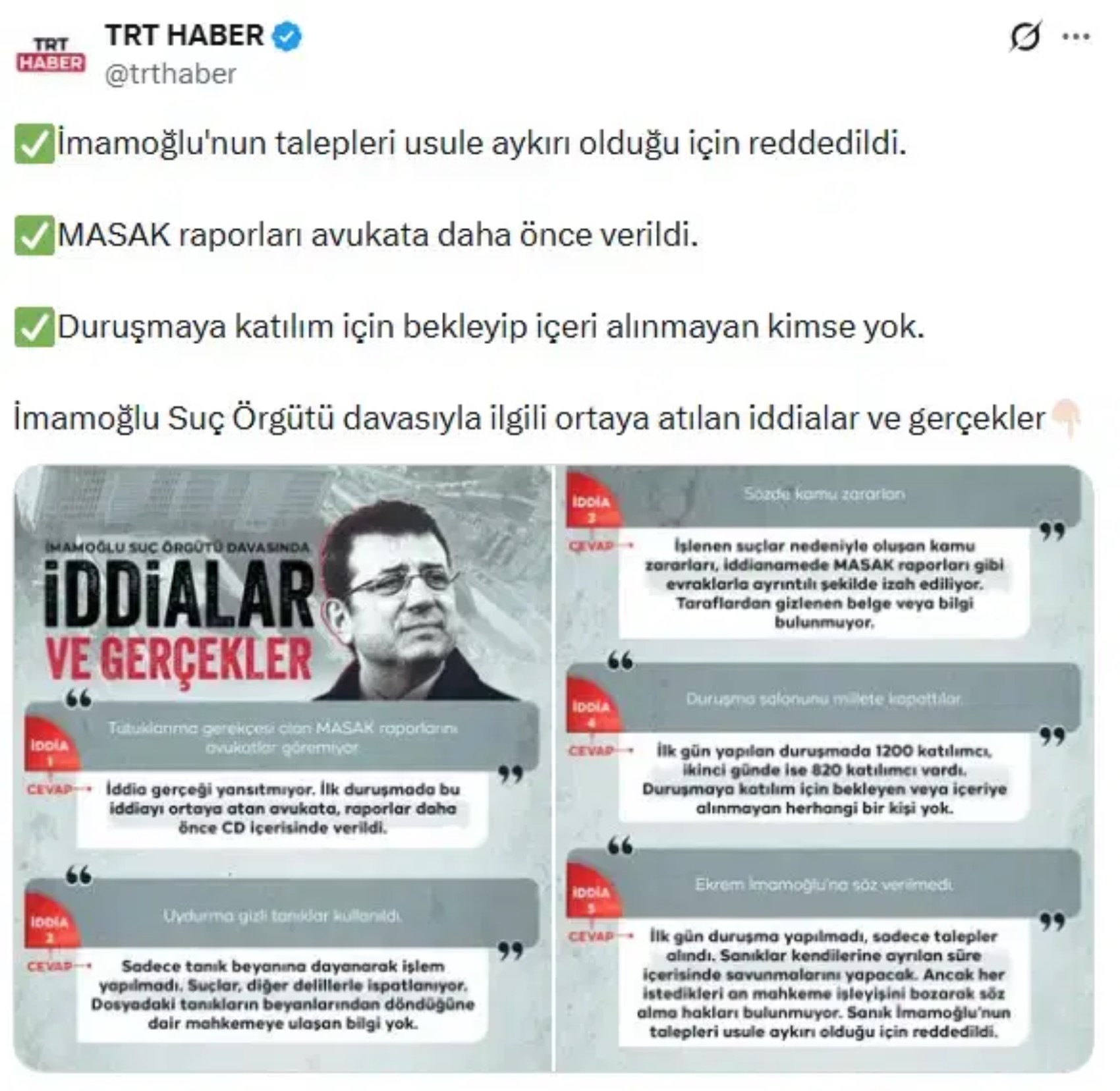 Yurttaşların vergileriyle finanse edilen TRT’nin haber kanalında yapılan “İBB davası” paylaşımı tepkilere neden olmuştu.