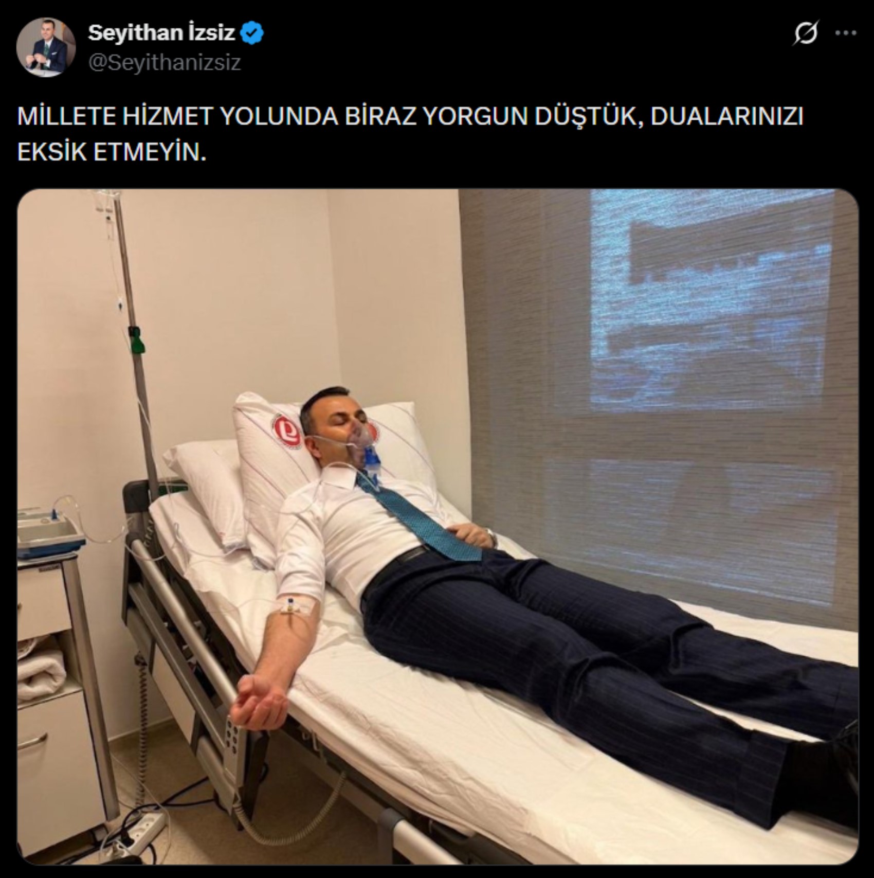 İzsiz, hastane odasında çekilmiş bir fotoğrafını paylaşarak, “Millete hizmet yolunda biraz yorgun düştük; dualarınızı eksik etmeyin” ifadelerini kullandı.