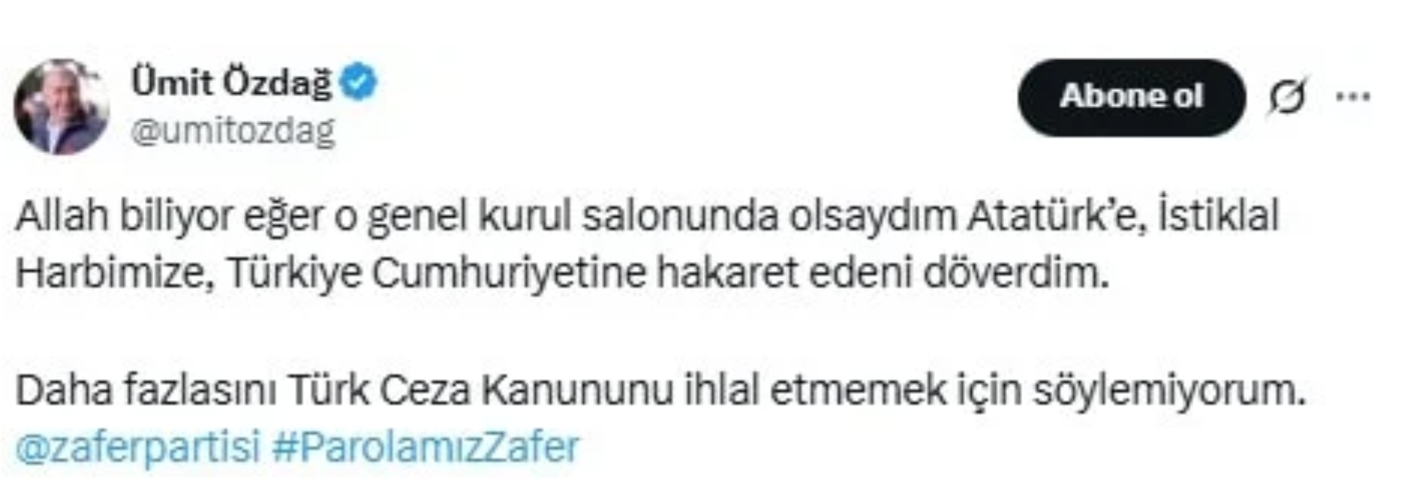 DEM Partili Sırrı Sakık'ın meclis kürsüsünde Cumhuriyetin Kurucusu Mustafa Kemal Atatürk'e yaptığı hakarete tepkiler sürüyor. Zafer Partisi Genel Başkanı Ümit Özdağ da Sakık'ın bu sözlerine kayıtsız kalmadı.