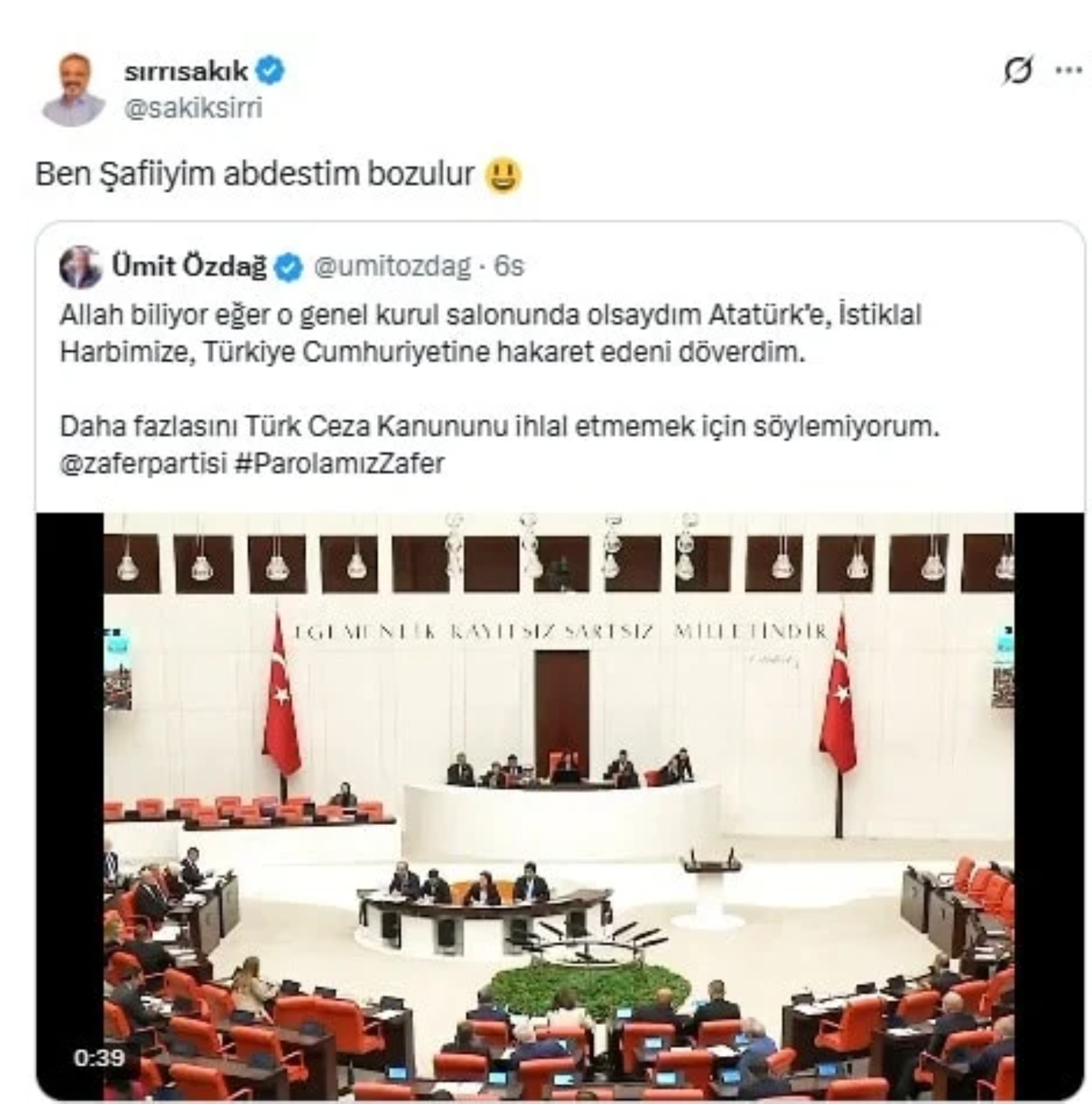 Zafer Partisi lideri Ümit Özdağ, Sırrı Sakık'ın ifadeleriyle ilgili olarak sosyal medya hesabından; "Allah biliyor eğer o genel kurul salonunda olsaydım, Atatürk'e, İstiklal Harbimize, Türkiye Cumhuriyetine hakaret edeni döverdim. Daha fazlasını Türk Ceza Kanununu ihlal etmemek için söylemiyorum" sözleriyle tepki gösterdi.