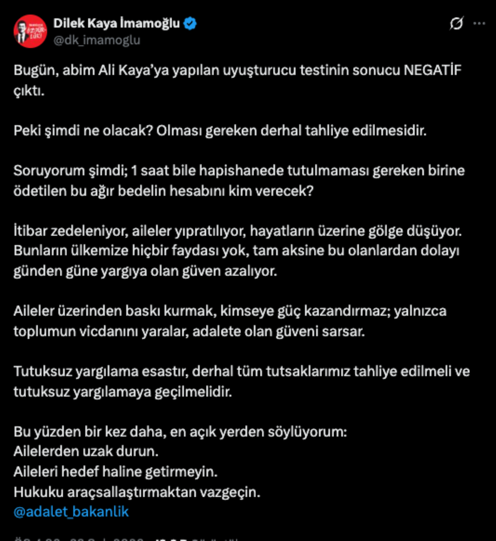 Test sonucunun negatif çıkmasının ardından Dilek İmamoğlu sosyal medya hesabından yaptığı paylaşım ile Adalet Bakanlığı'na seslendi.