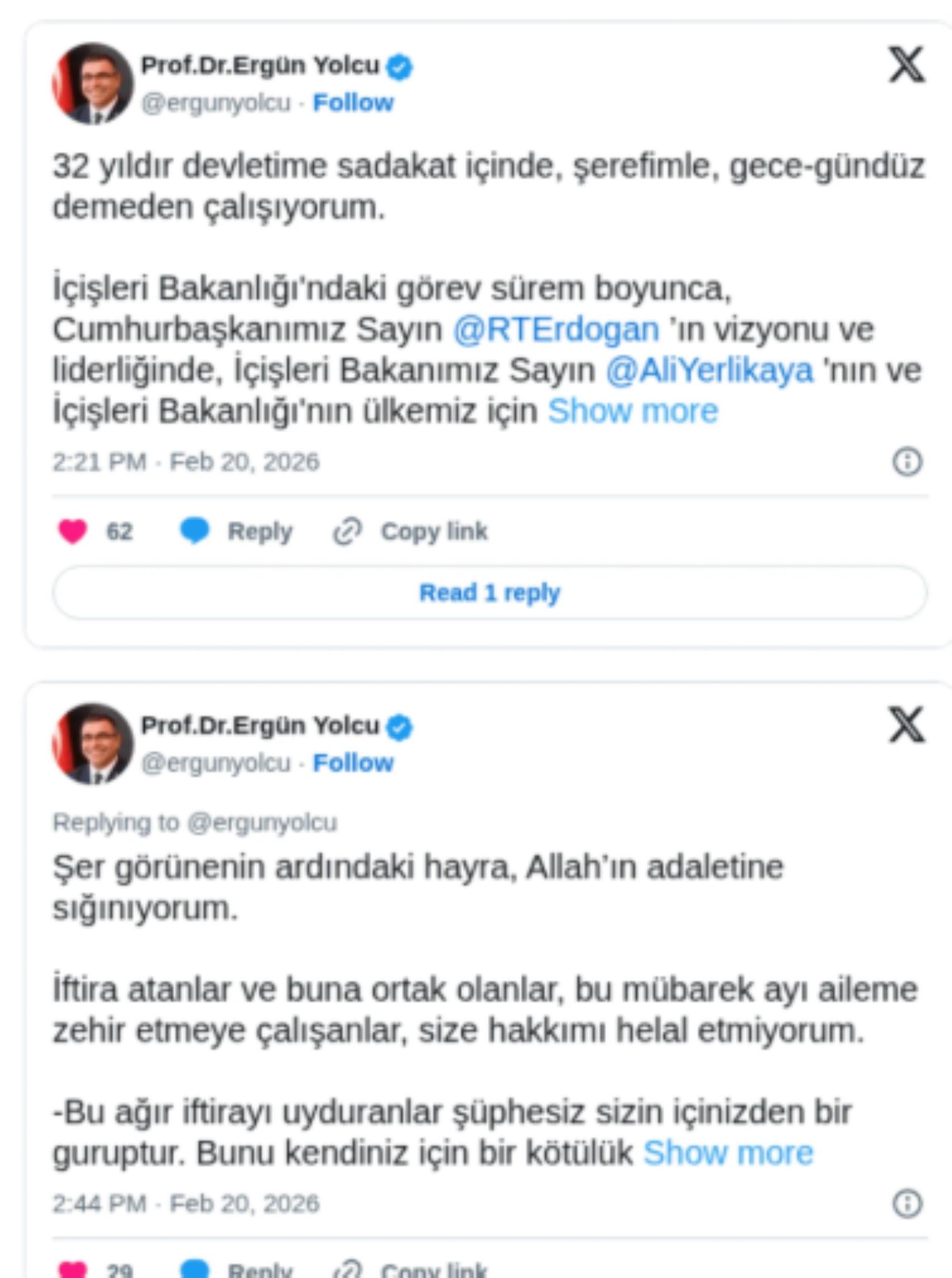Eski İçişleri Bakanı Ali Yerlikaya'nın danışmanı Ergün Yolcu, hakkında ortaya atılan "bakanlıktan bilgi sızdırdığı" iddialarına ilişkin sosyal medya hesabından açıklama yaptı.