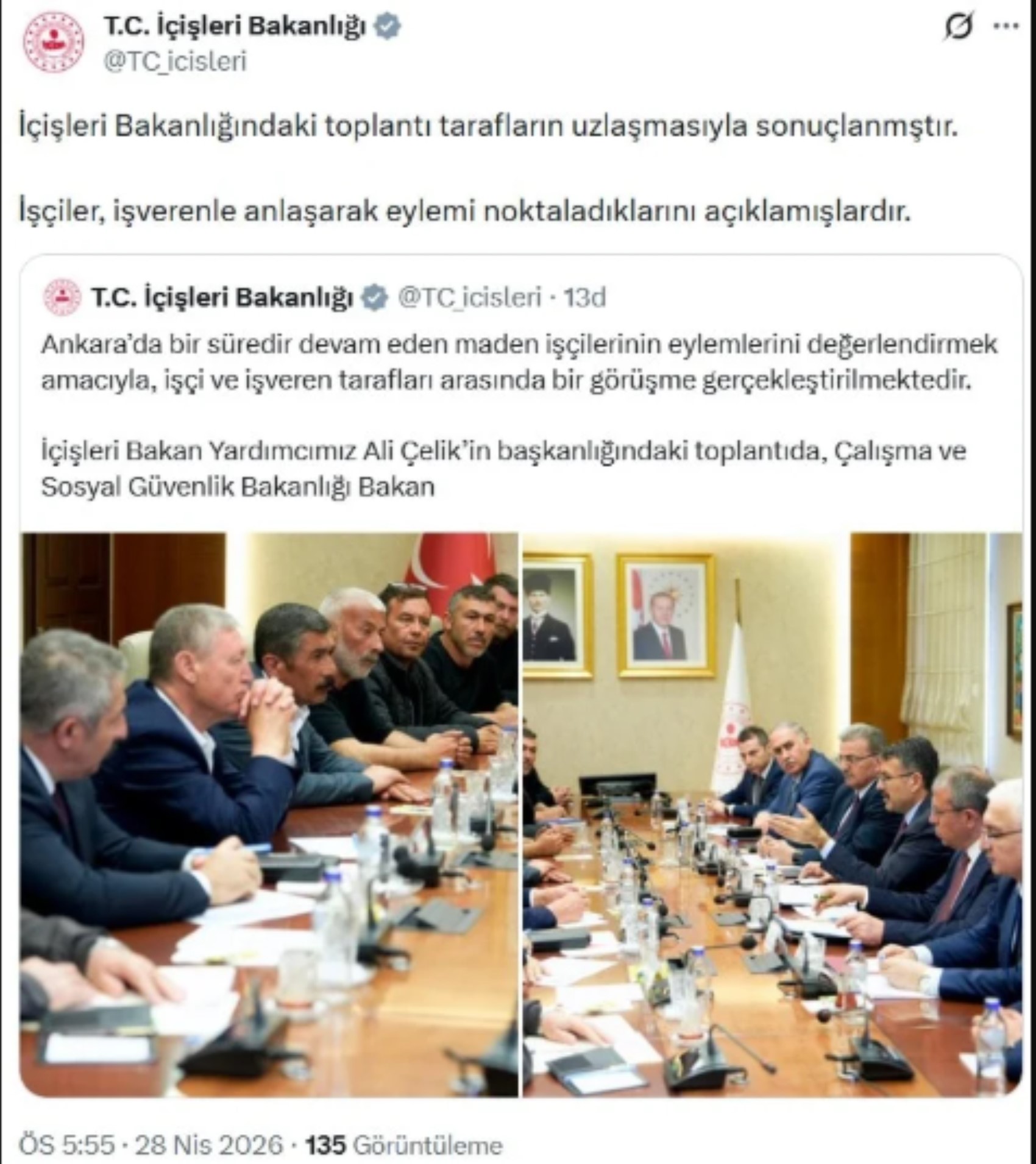 İçişleri Bakanlığı, Ankara'da alacaklarının ödenmesi talebiyle eylemlerini sürdüren Doruk Madencilik işçileriyle işveren arasındaki toplantının, tarafların uzlaşmasıyla sonuçlandığını bildirdi.