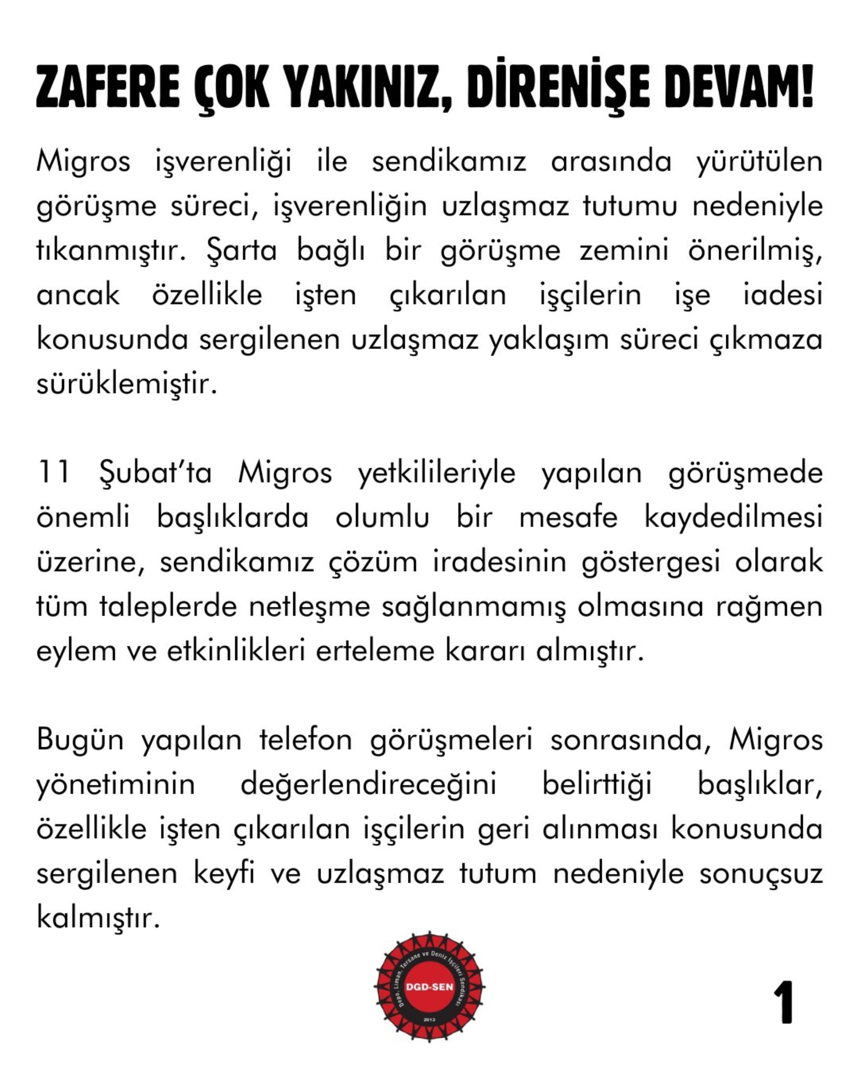 Talepleri; net yüzde 50 zam, banka promosyonlarının eksiksiz işçiye ödenmesi, verginin işveren tarafından ödenmesi, ayrımsız-şartsız ve işkolu değişmeksizin tüm Migros taşeronlarına kadro olan Migros depo işçileri için 11 Şubat (Bugün) 14:00’da Depo, Liman, Tersane ve Deniz İşçileri Sendikası (DGD-SEN) ile Migros yönetimi arasındaki ikinci müzakere toplantısı başlamıştı. DGD-SEN toplantıda, önemli mesafeler katedildiğini iletse de tam anlaşma sağlanamadı ve çözüme kavuşturulamayan maddeler için 13 Şubat Cuma gününde müzakere toplantılarının devam edeceğini duyurmuştu.