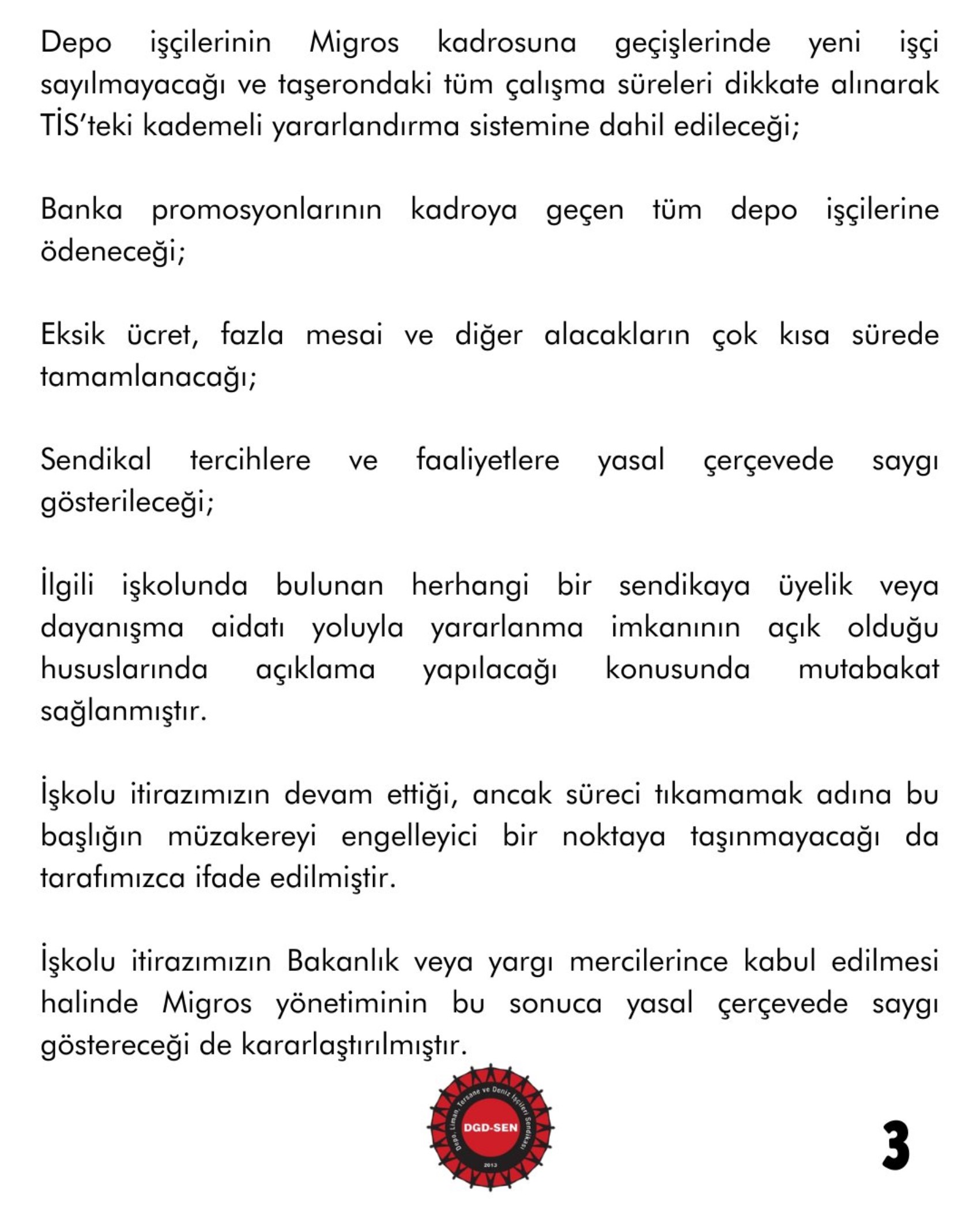 DGD-SEN, X hesabı üzerinden yaptığı eylem çağrısının nedenini yeniden vurguladı ve Migros yönetimiyle mutabakat sağlanan gelişmeleri 13 Şubat Cuma günü (Bugün) şöyle açıkladı: