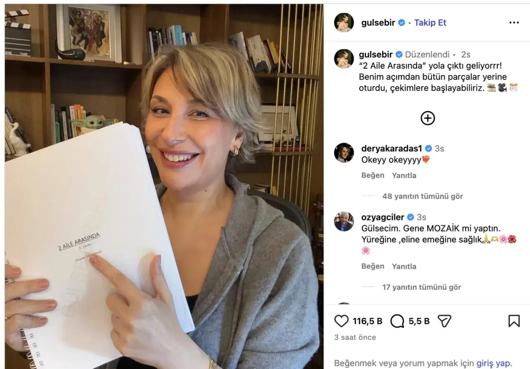 Başarılı komedi filmi "Aile Arasında"nın devamı için geri sayım resmen başladı. Gülse Birsel, "2 Aile Arasında" senaryosunu bitirdiğini duyurdu ve ekip çekimlere geçmeye hazırlanıyor.