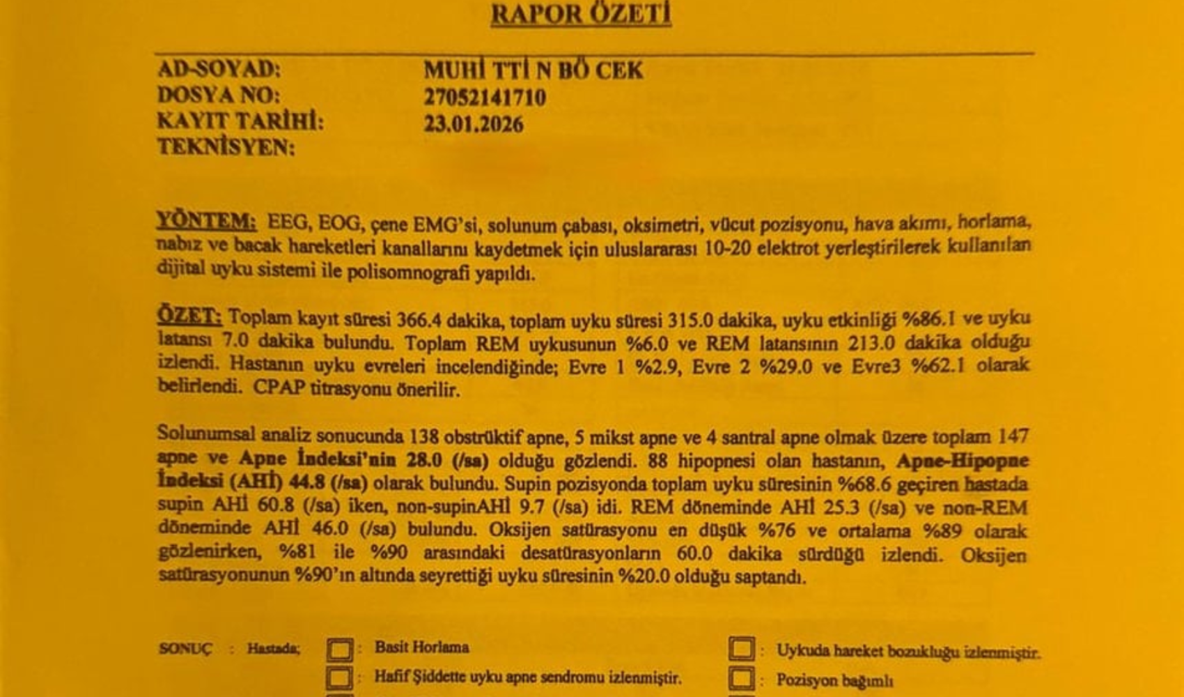 Antalya Şehir Hastanesi’nde gerçekleştirilen polisomnografi yani uyku testi sonucunda hazırlanan raporda, Böcek’in geceyi çok sayıda solunum durması ve oksijen düşüklüğüyle geçirdiği ortaya çıktı. Rapor verilerine göre, Böcek’in her saat başına ortalama 44,8 kez solunumunda durma veya yavaşlama yaşandığı saptandı. Bu tanı, tıp literatüründe “ağır uyku apnesi” olarak değerlendirilmekte.