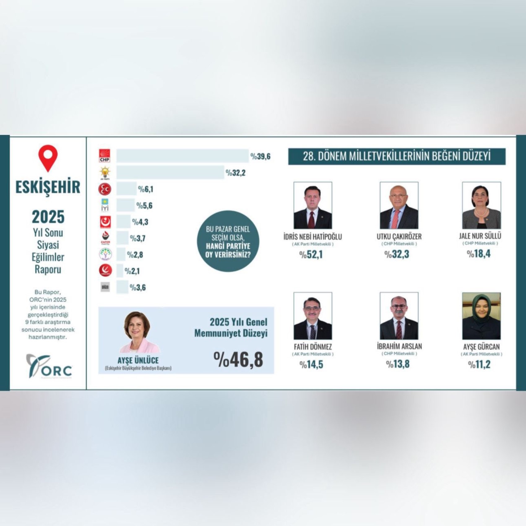 AKP'li Nebi Hatipoğlu, ORC Araştırma’nın yaptığı "28. Dönem Milletvekilleri Beğeni Düzeyi" anketinde Eskişehir'de %52,1 ile birinci sırada yer aldı. CHP'li Utku Çakırözer ise %32,3 ile ikinci oldu.