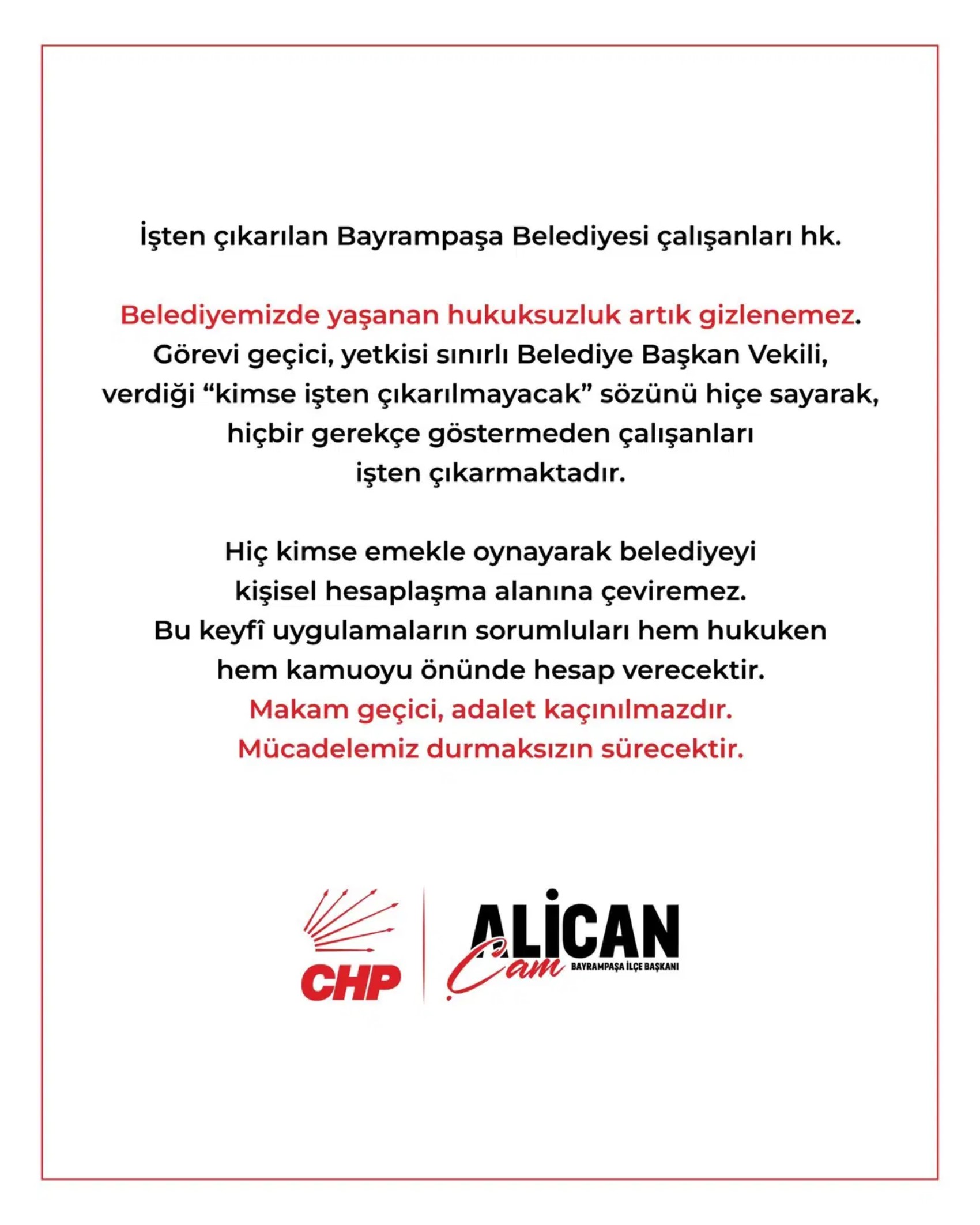 Bayrampaşa Belediyesi'nde, AKP'li Başkanvekili İbrahim Akın'ın çalışanları gerekçesiz işten çıkardığı iddiaları, CHP tarafından sert bir şekilde eleştirildi.