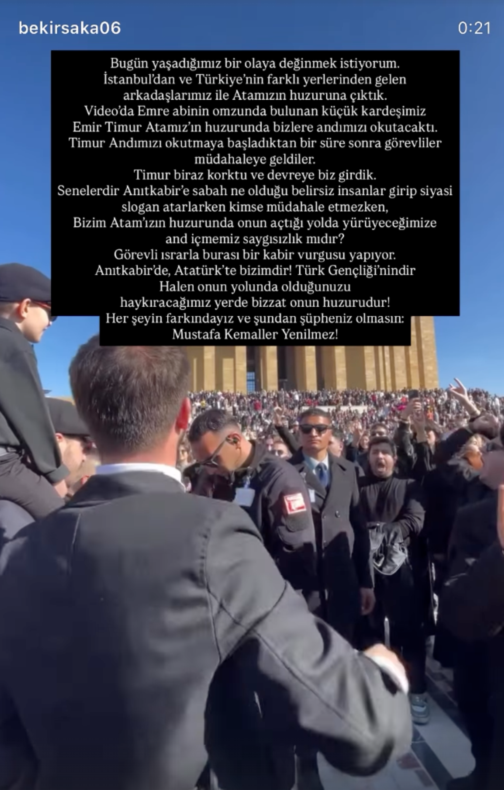 Olayın ardından gençlerden biri, sosyal medya üzerinden yaptığı açıklamada, “İstanbul’dan ve Türkiye’nin farklı yerlerinden gelen arkadaşlarımızla Atamızın huzuruna çıktık. Küçük kardeşimiz Emir Timur, Andımız’ı okumaya başladığında görevliler müdahaleye geldi. Senelerdir sabah saatlerinde Anıtkabir’e girip siyasi slogan atanlara kimse karışmazken, biz Atamızın huzurunda onun yolunda yürüyeceğimize and içtiğimiz için uyarıldık. Görevli sürekli ‘burası bir kabir’ vurgusu yapıyor. Anıtkabir de Atatürk de bizimdir! Türk gençliğinindir! Mustafa Kemaller yenilmez!” ifadelerini kullandı.