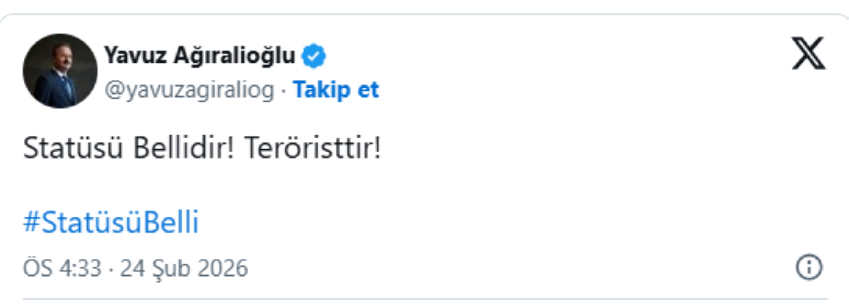 Ağıralioğlu sosyal medya hesabından, “Statüsü bellidir; Teröristtir” ifadelerini kullandı.