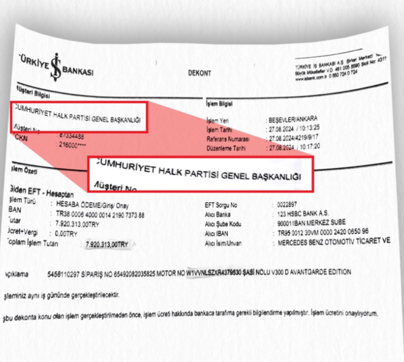 CHP’nin açıklamasında, “Genel Başkanımızın makam aracıyla ilgili iftiralar havada uçuşunca bu belgeyi yayınlamak şart oldu. Yalanlarla gündem oluşturmaya çalışanlar, Genel Merkezimizin yaptığı ödemenin belgesine iyi baksın” ifadelerine yer verildi.