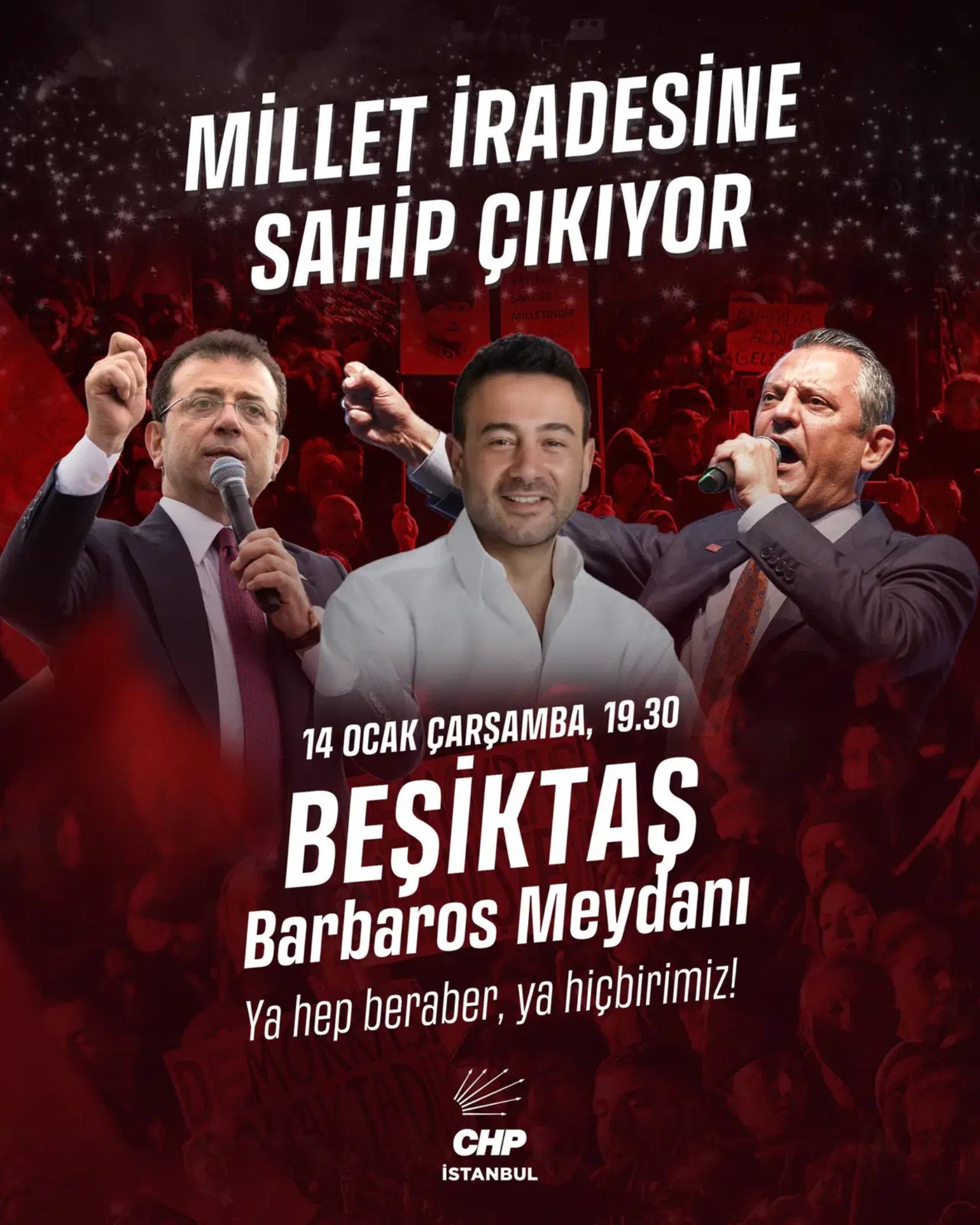 Cumhuriyet Halk Partisi'nin "Millet İradesine Sahip Çıkıyor" mitinglerinin yeni adresi Beşiktaş olarak duyuruldu. İstanbul İl Başkanı Özgür Çelik'in açıklamasına göre buluşma 14 Ocak Çarşamba günü Barbaros Meydanı’nda gerçekleşecek.