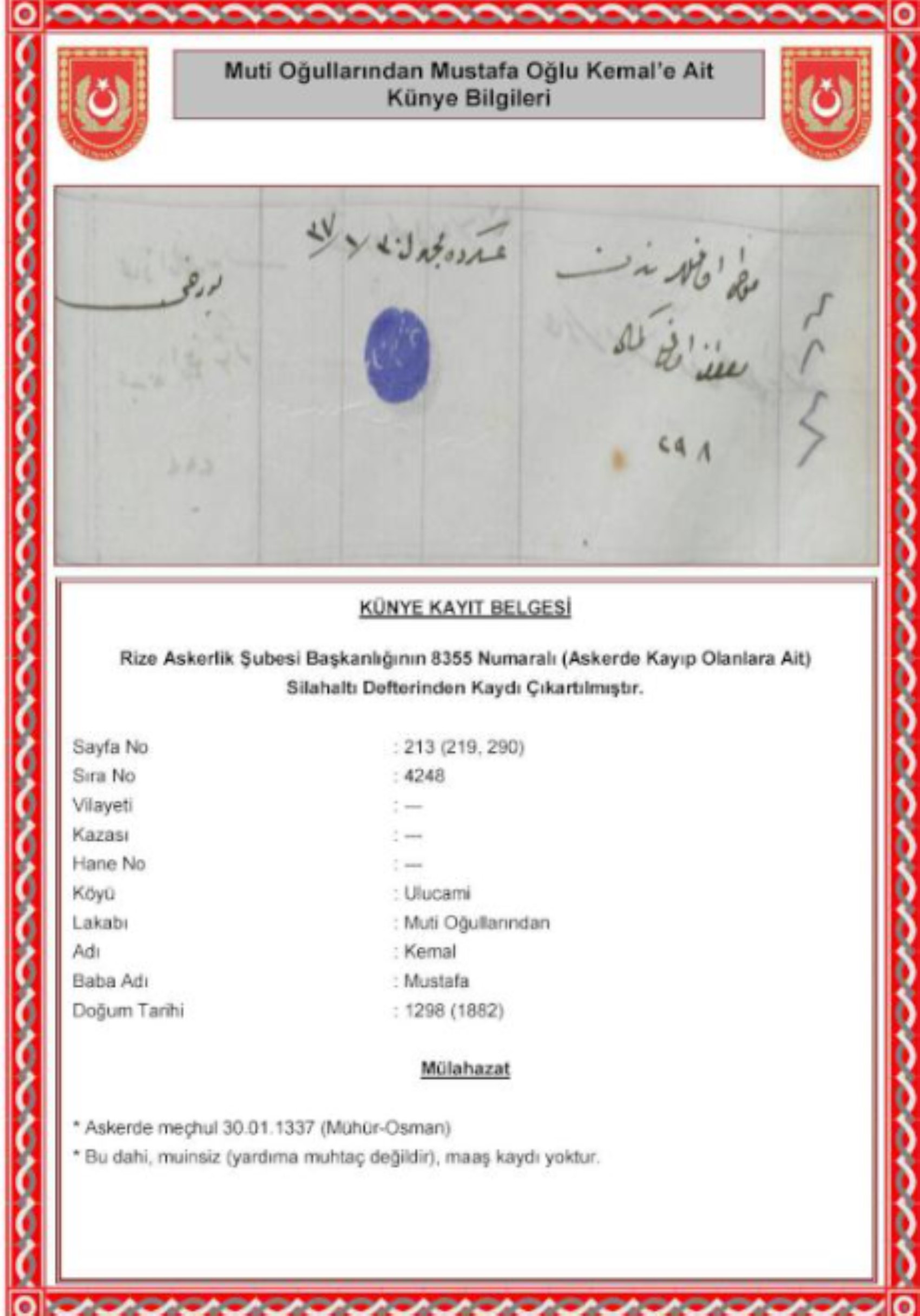 Milli Savunma Bakanlığı tarafından 2018 yılında yapılan açıklamada, Cumhurbaşkanı Erdoğan’ın dedesi Mustafa oğlu Kemal’in Sarıkamış Harekâtı’nda askere gittiği ve askerlik görevi sırasında şehit olduğu belirtilmişti. Açıklamada, arşiv kayıtlarında “askerde meçhul” ifadelerinin yer aldığı bildirilmişti.