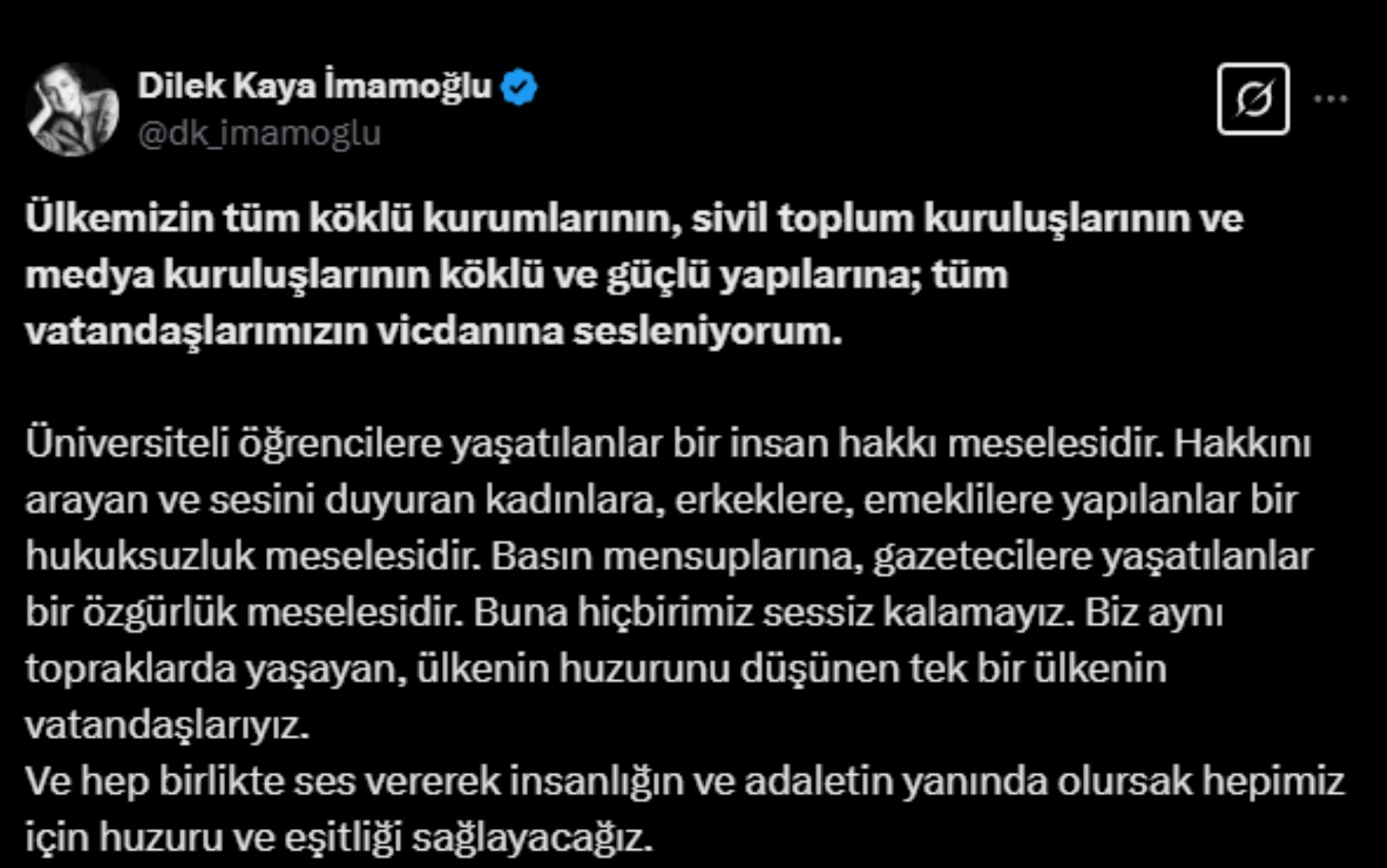 Dilek İmamoğlu, "Ülkemizin tüm köklü kurumlarının, sivil toplum kuruluşlarının ve medya kuruluşlarının köklü ve güçlü yapılarına; tüm vatandaşlarımızın vicdanına sesleniyorum," diyerek toplumu özgürlük, adalet ve insan hakları konusunda duyarlı olmaya davet etti.