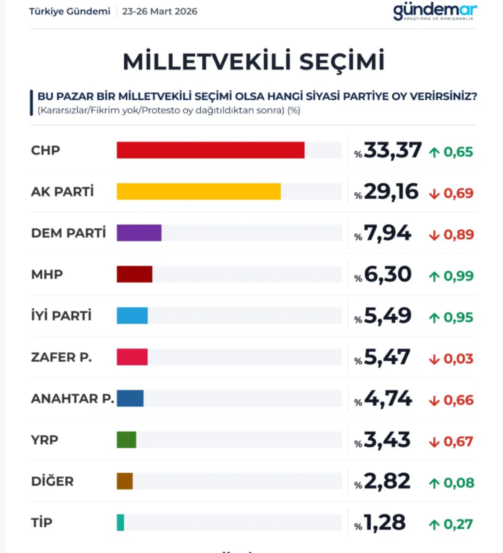 CHP’nin yüzde 33,37’lik oranla ilk sıraya yerleştiği ankette, AKP yüzde 29,16 ile ikinci sırada yer aldı.