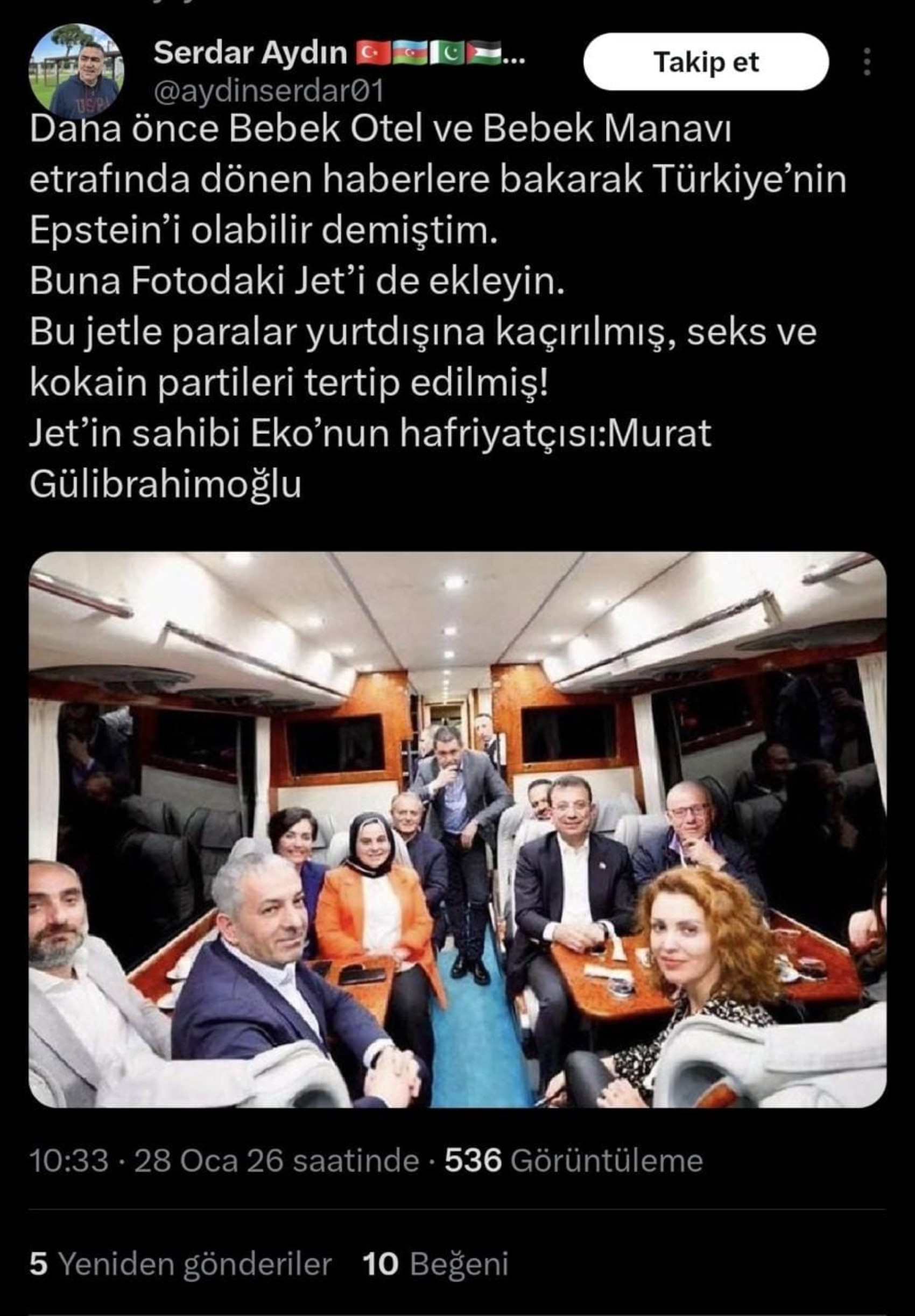 TRT Dış Yayınlar Daire Başkan Yardımcısı Serdar Aydın, tutuklu İBB Başkanı Ekrem İmamoğlu’nun Karadeniz gezisinde çekilen otobüs fotoğrafı üzerinden, gerek İmamoğlu’na gerekse yanında bulunan gazetecilere yönelik ağır ithamlarda bulundu. Söz konusu paylaşımda ayrıca fotoğraf firari Murat Gülibrahimoğlu’na ait jet ile ilişkilendirildi.