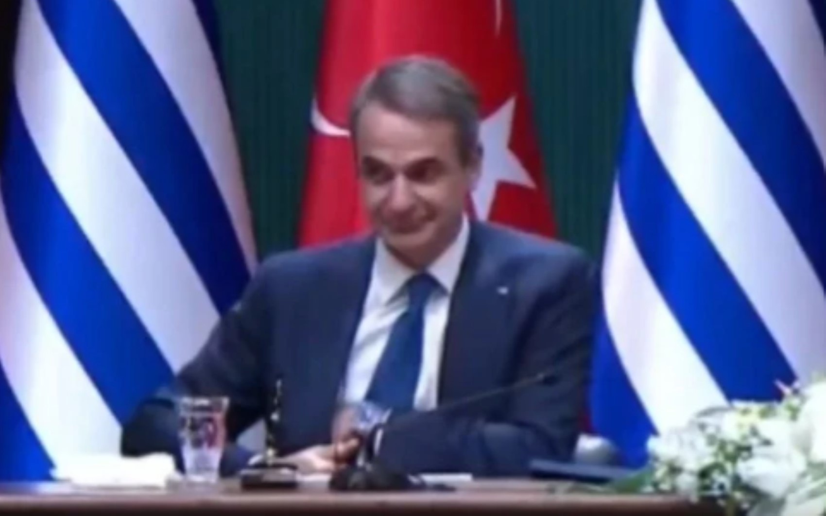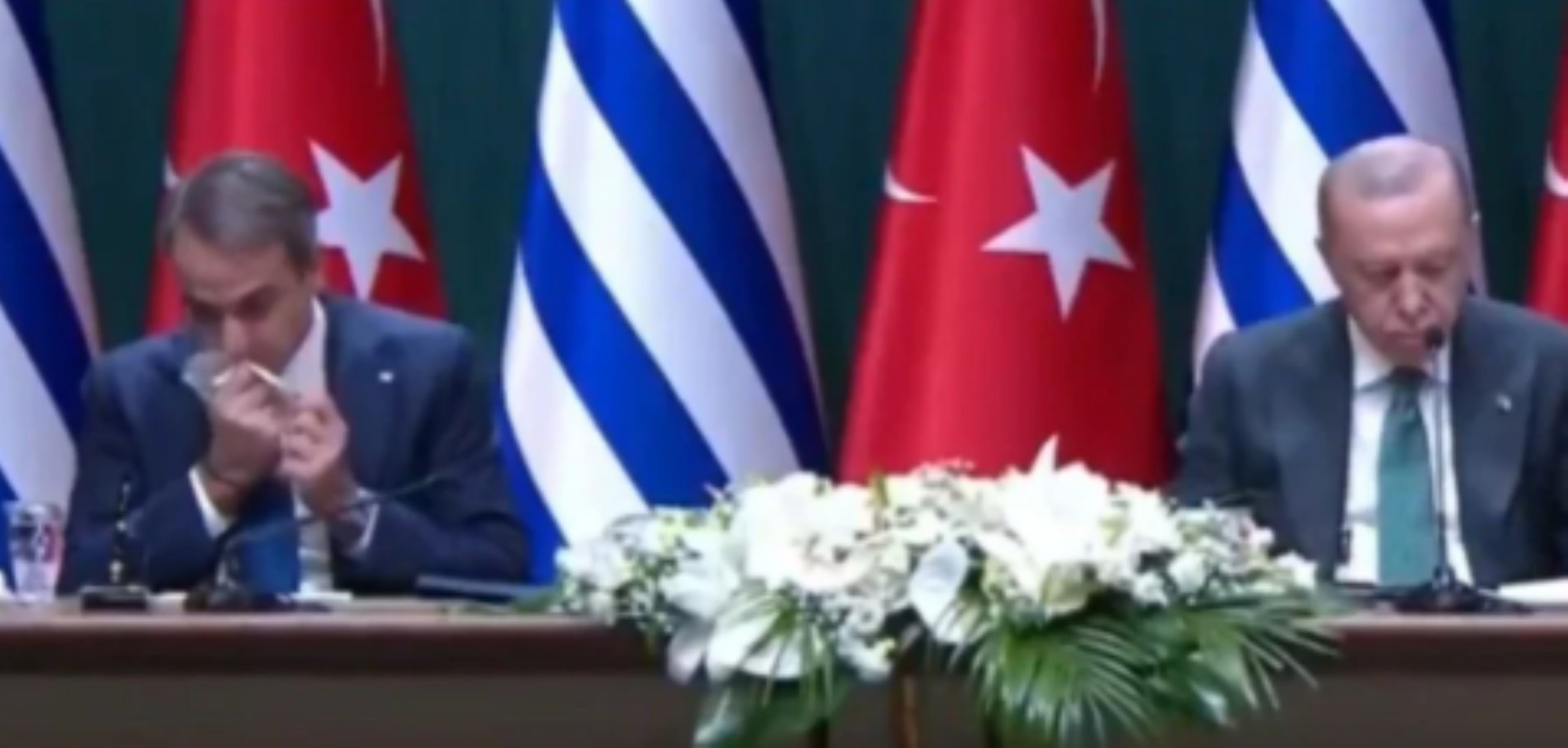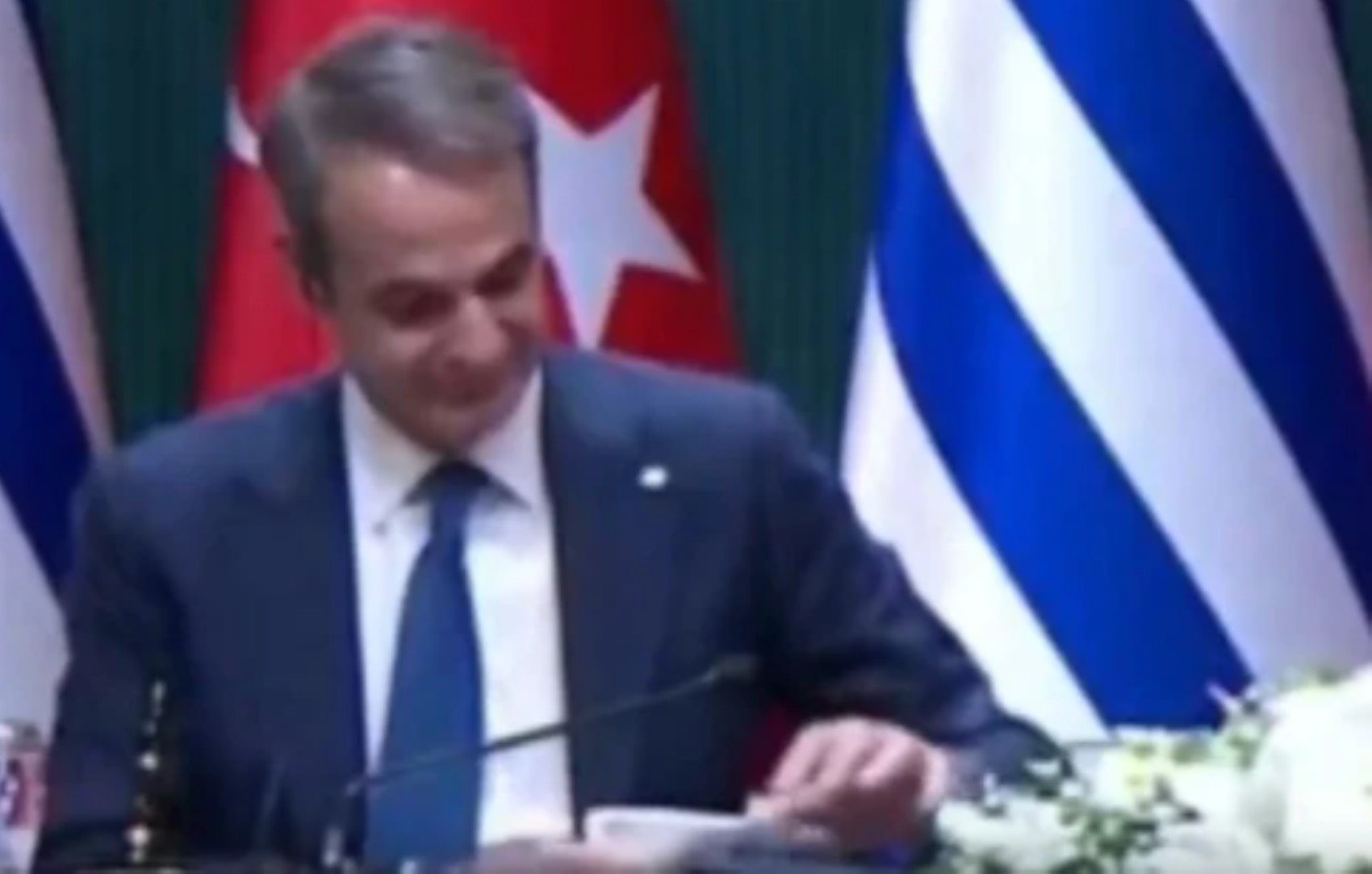 Yunanistan Başbakanı Kiryakos Miçotakis’in, Cumhurbaşkanı Erdoğan ile birlikte düzenlediği basın toplantısı sırasında mendilini masa üzerindeki dosyanın içine koyması, Yunan sosyal medya kullanıcılarının tepkisini çekti. O anlara dair görüntüler kısa sürede internetin gündemine oturdu.