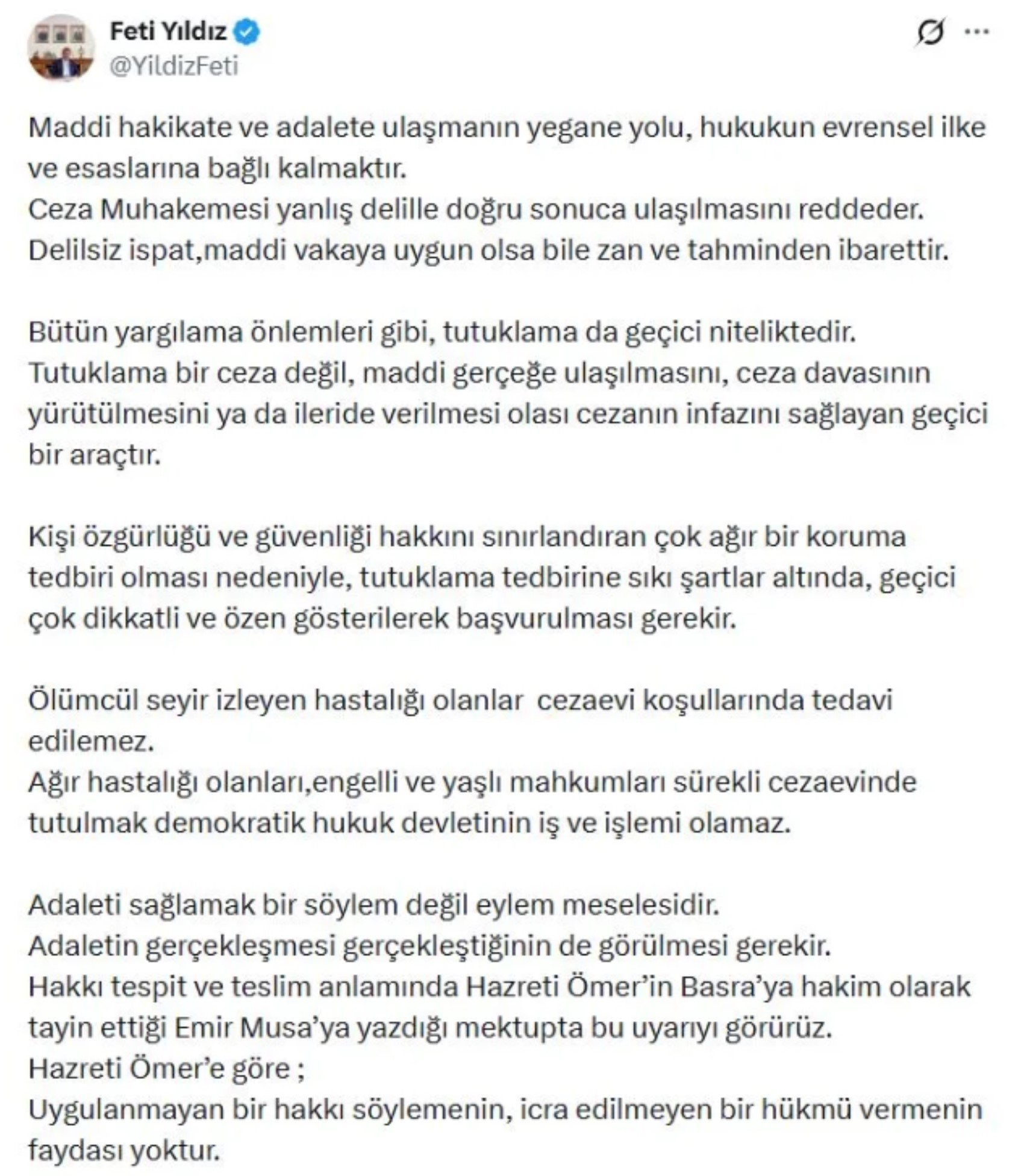 MHP Genel Başkan Yardımcısı Feti Yıldız, sosyal medya üzerinden yaptığı açıklamalarla tutuklama kararları hakkında önemli değerlendirmelerde bulundu. Yıldız, tutuklamanın kişi özgürlüğünü kısıtlayan ciddi bir işlem olduğunu ve sadece geçici bir önlem olarak uygulanması gerektiğini söyledi.
