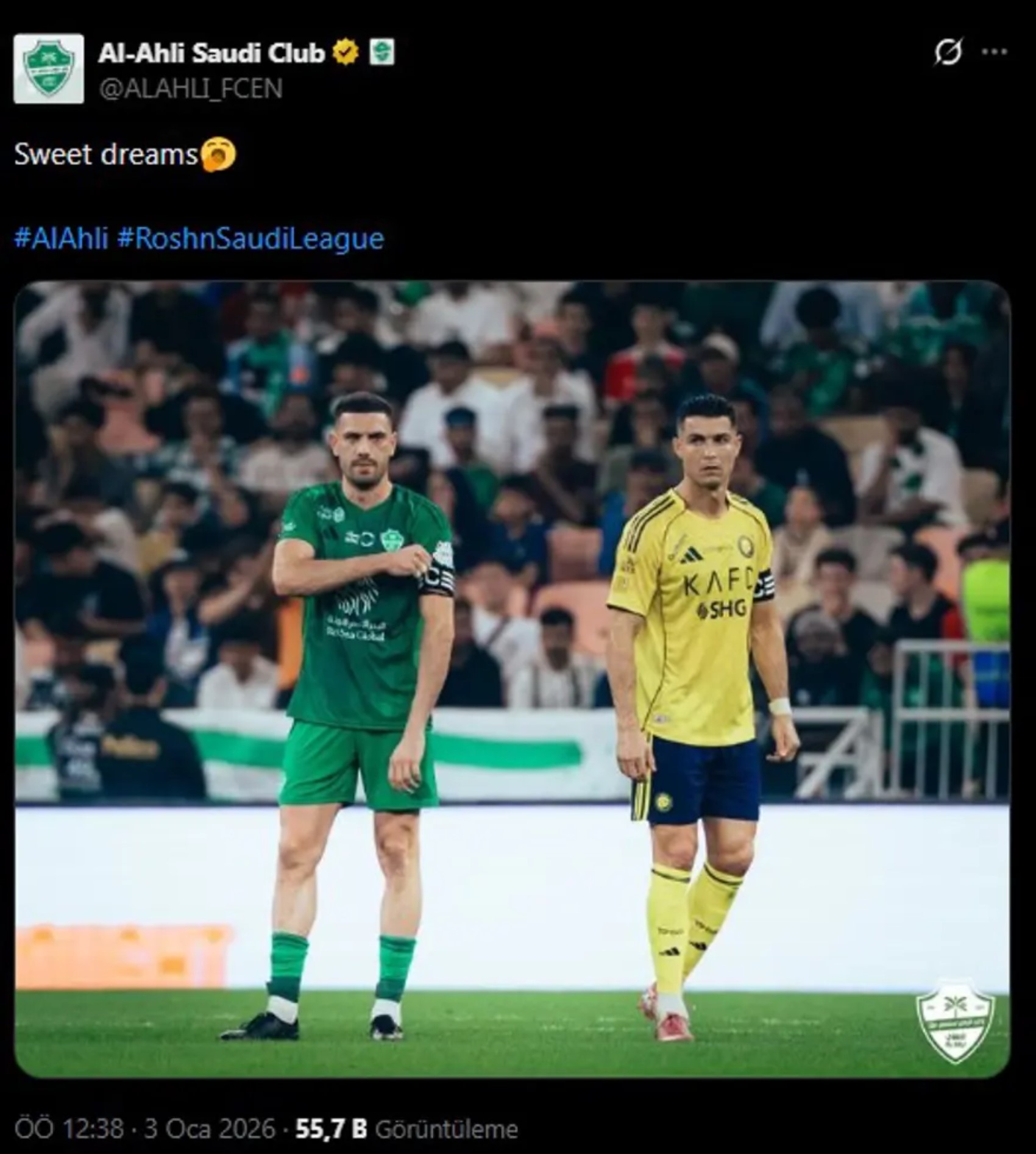 Karşılaşmanın bitiş düdüğünün ardından Al Ahli’nin sosyal medya hesabından yapılan paylaşımlar gündem oldu. Merih Demiral’ın ön plana çıkarıldığı paylaşımlarda Cristiano Ronaldo’ya gönderme yapıldı.