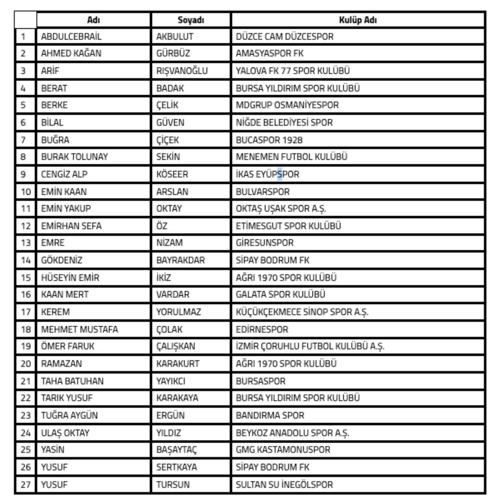"Türkiye Futbol Federasyonu’nca profesyonel liglere yönelik olarak yürütülen bahis soruşturması kapsamında 10.11.2025 tarihinde PFDK’ya sevk edilen 1024 futbolcunun haricinde sadece tek bir kere bahis hareketi olduğu görülen ve incelemesi devam eden 47 futbolcudan soruşturması tamamlanan aşağıdaki 27 futbolcunun Futbol Disiplin Talimatı’nın 57. maddesi uyarınca 09.12.2025 tarihinden itibaren tedbirli olarak PFDK'ya sevk edilmesine karar verilmiştir.