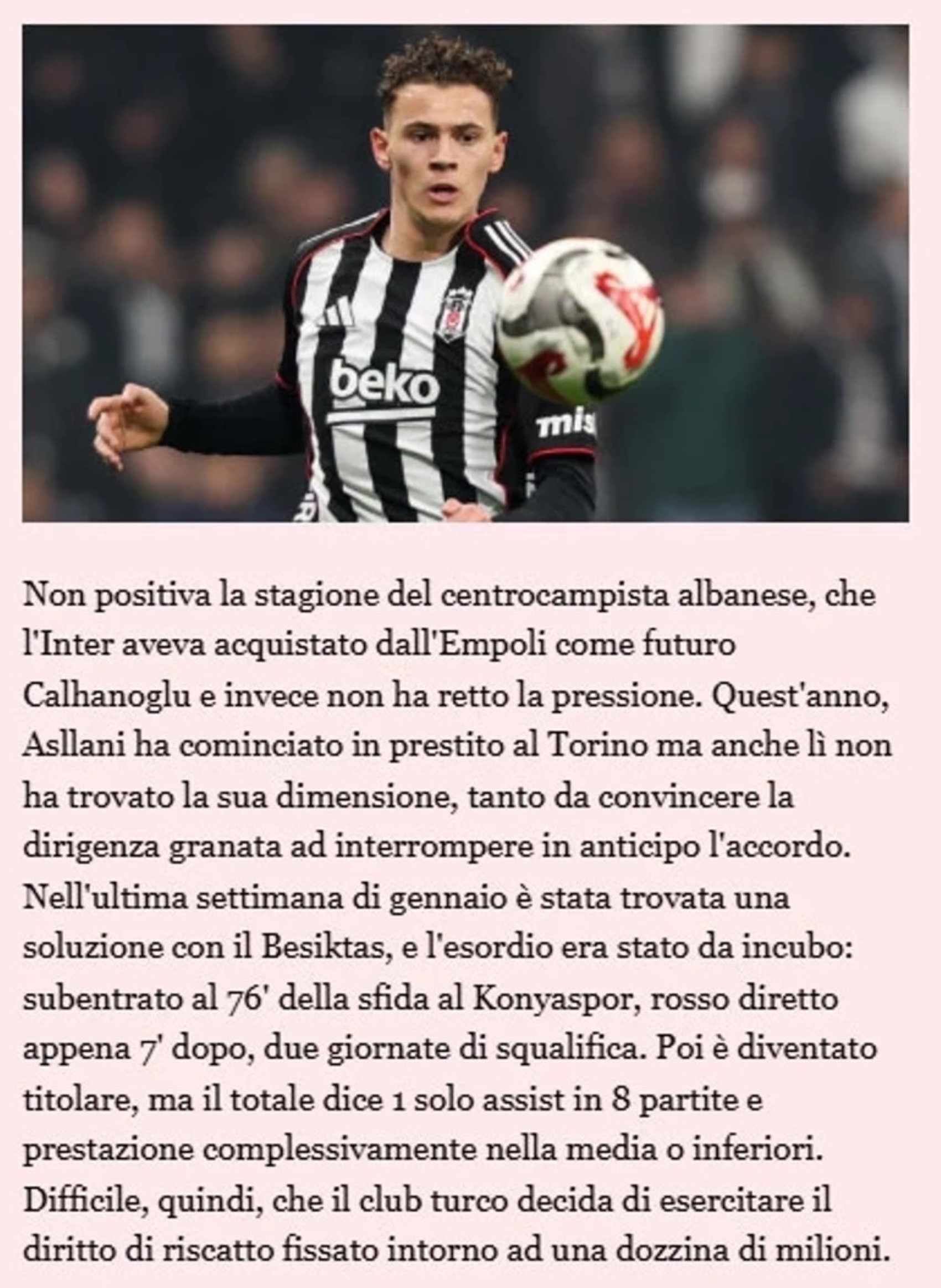 İtalya La Gazzetta'da yer alan habere göre Beşiktaş, Inter'den kiraladığı Asllani'nin bonservisini almayacak. Konuya ilişkin yer alan haber şu şekilde oldu: