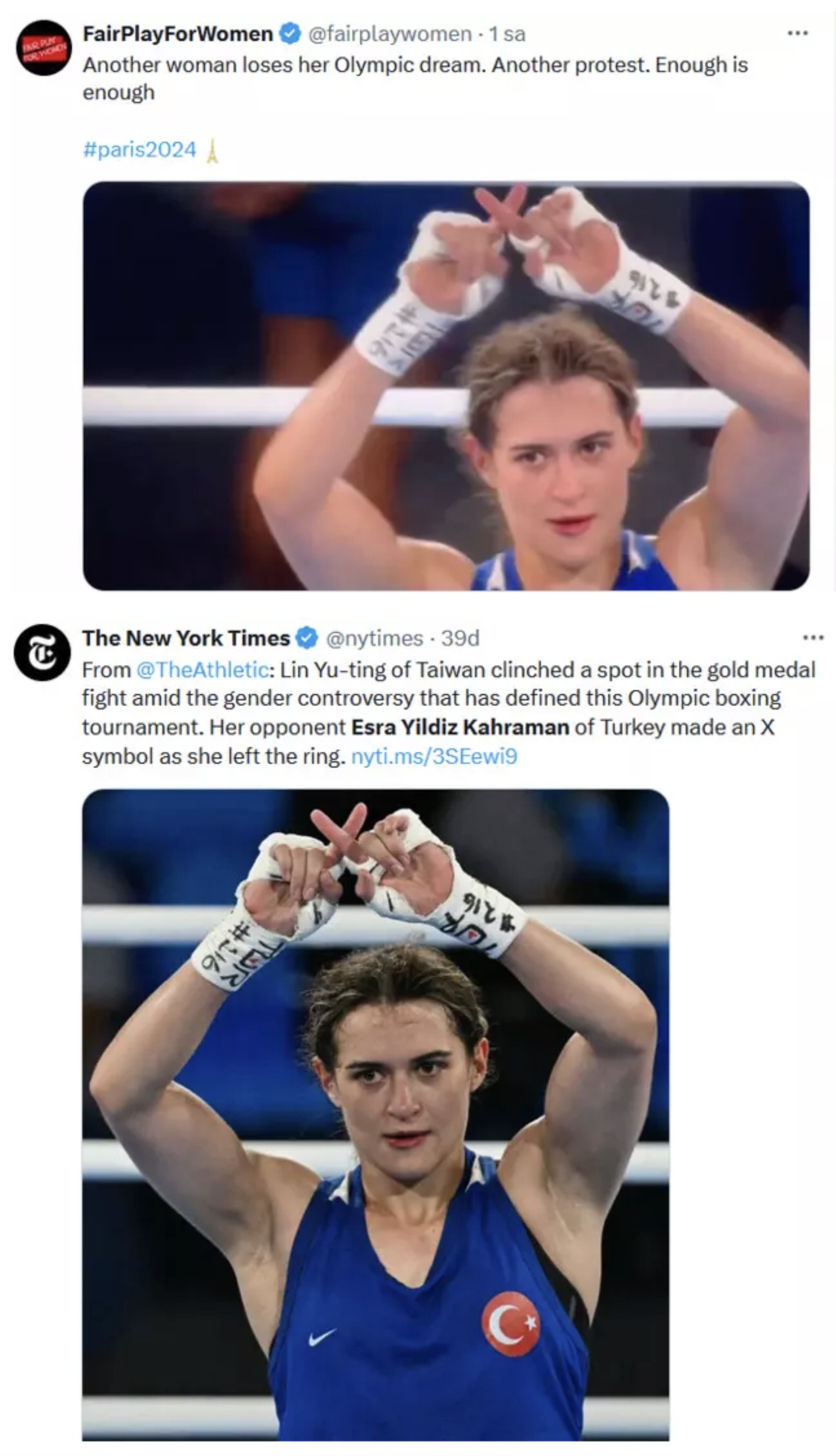 Milli sporcumuz maç sonrası ringde elleriyle "X" işareti yaptı. Kahraman bu hareketi ile cinsiyet tartışmasının merkezindeki Cezayirli boksör Imane Khelif'e ve rakibi Tayvanlı boksör Lin Yu-Ting'e gönderme yaptı.