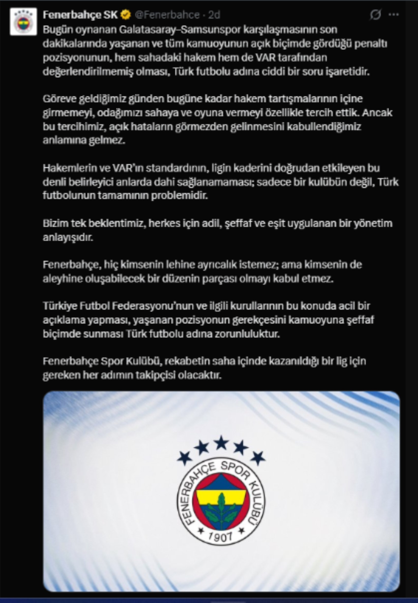 "Bugün oynanan Galatasaray–Samsunspor karşılaşmasının son dakikalarında yaşanan ve tüm kamuoyunun açık biçimde gördüğü penaltı pozisyonunun, hem sahadaki hakem hem de VAR tarafından değerlendirilmemiş olması, Türk futbolu adına ciddi bir soru işaretidir.