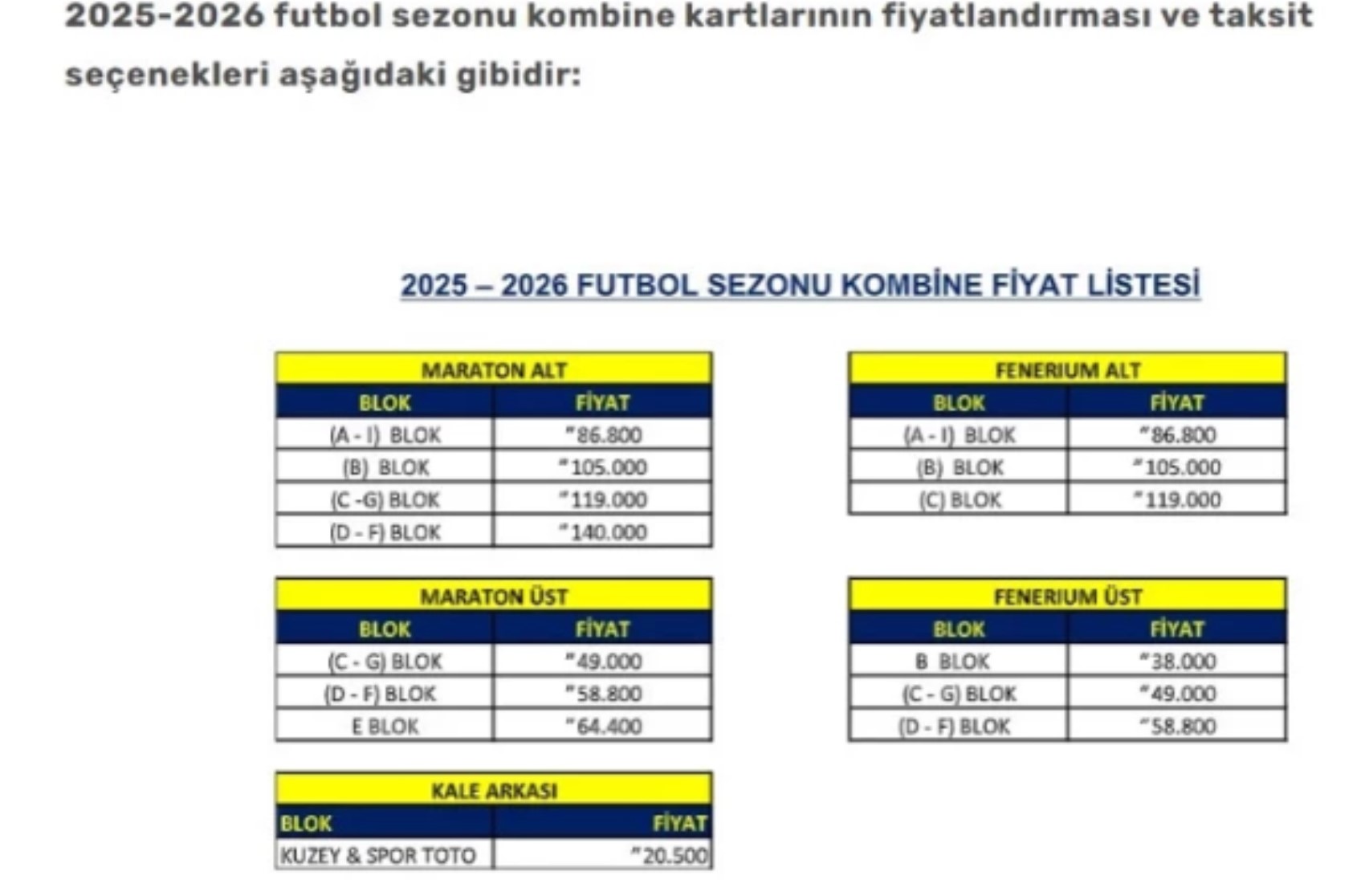 FENERBAHÇE KOMBİNE BİLET FİYATLARI