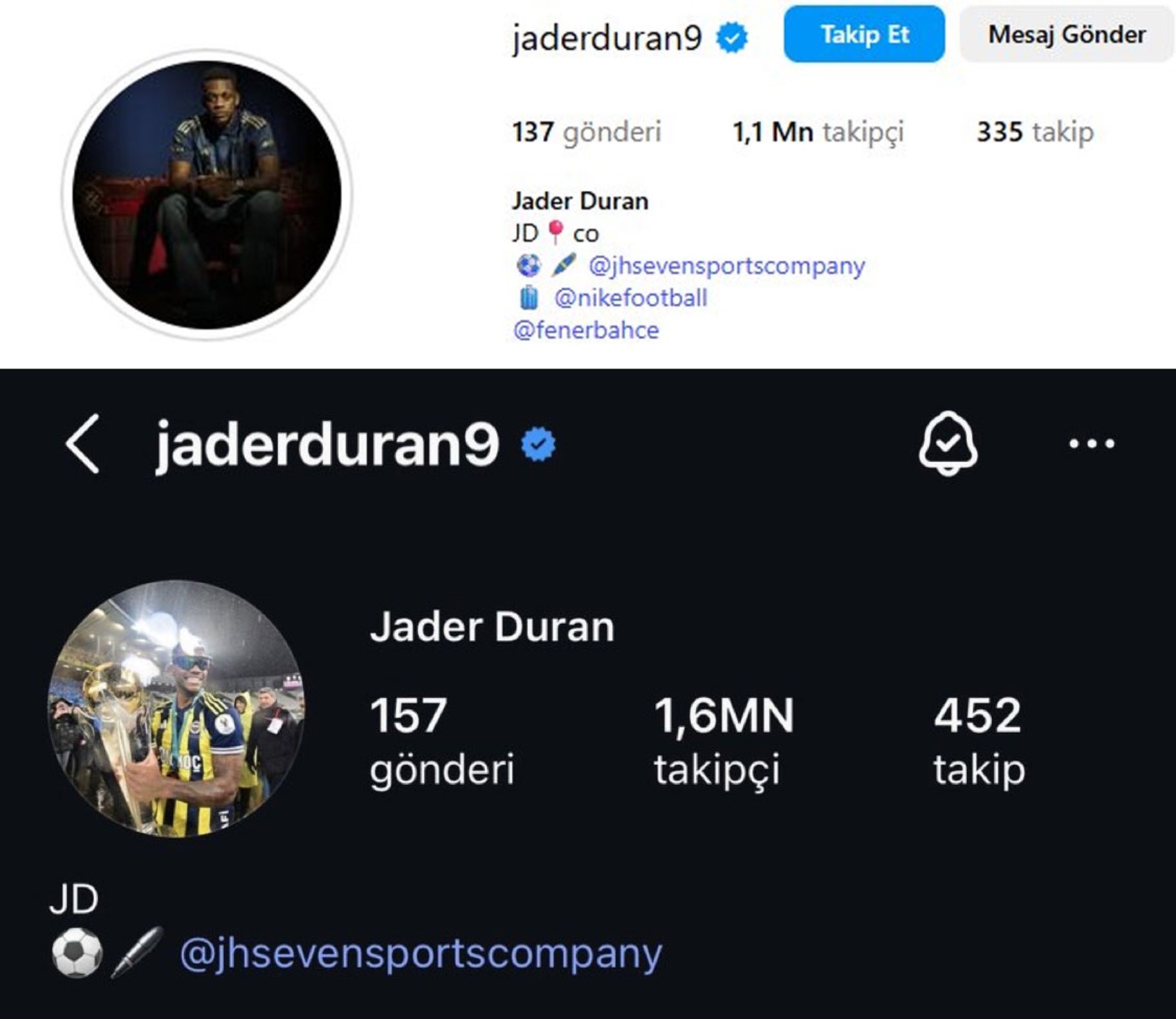 Öte yandan, transfer söylentilerini güçlendiren bir detay daha dikkat çekti. Jhon Duran’ın Instagram hesabındaki biyografi bölümünden “Fenerbahçe” ifadesini sildiği görüldü. Bu hamle, sosyal medyada ayrılık ihtimaliyle ilgili yorumların artmasına neden oldu.