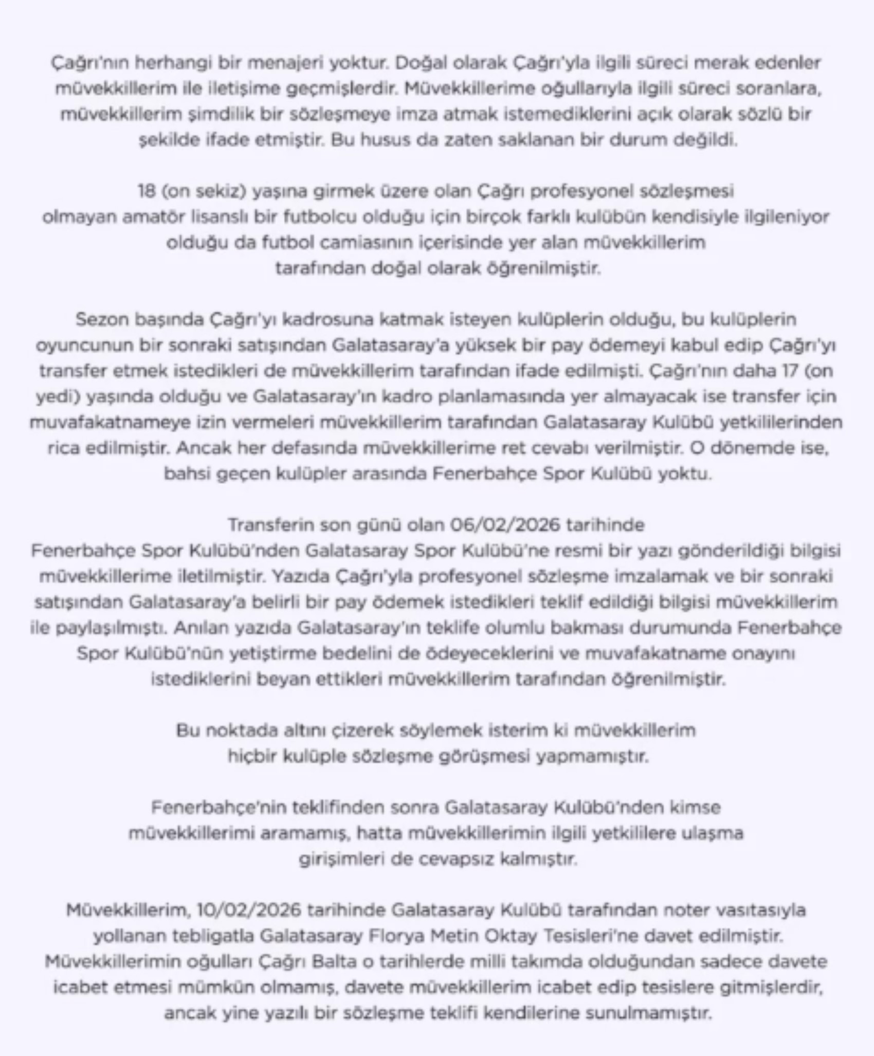 Çağrı Balta'nın avukatı Mustafa Kandönmez, "Galatasaray, Çağrı’ya kendi yaş grubunda alt yapı oyuncuları arasında en yüksek maaşı teklif etmesine karşın, müvekkillerim hiçbir maddi beklentilerinin olmadığını ve dakika fark etmeksizin Çağrı’nın sezon içerisinde kadro rotasyonuna yapılan sadece üç maçta süre almasını istediklerini beyan etmişlerdir.