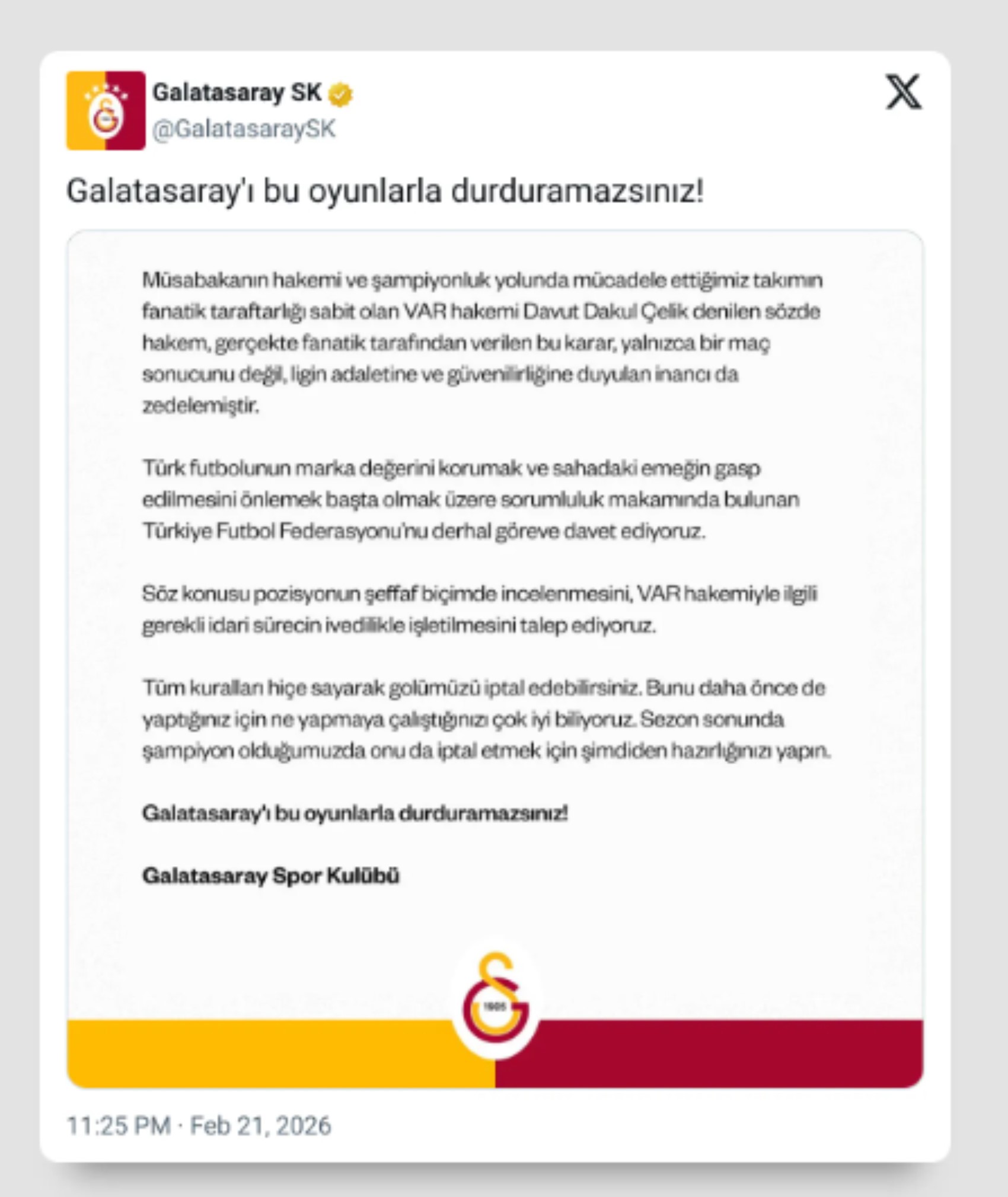 "T. Konyaspor-Galatasaray karşılaşmasında takımımızın attığı nizami golün, ofsayt kuralının açık hükümlerine rağmen iptal edilmesi Türk futbolu adına kabul edilemez bir skandaldır.