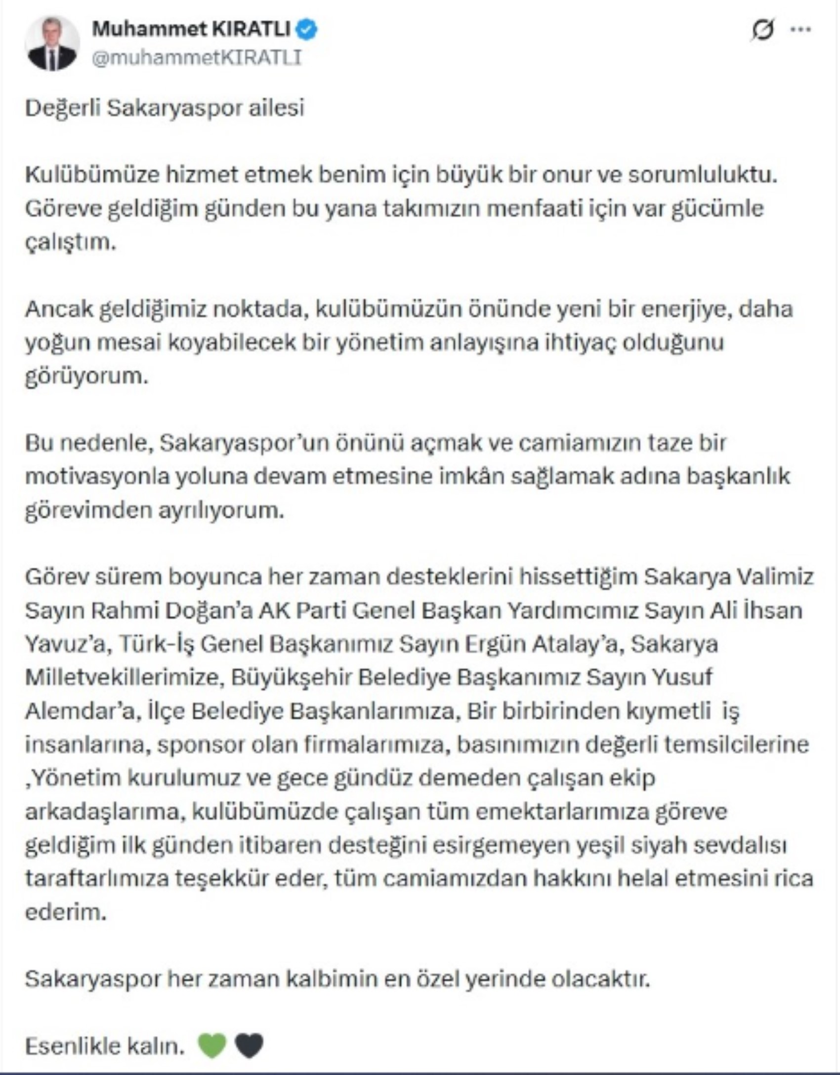 Ziraat Türkiye Kupası 4’üncü tur maçında sahasında Gençlerbirliği’ne 5-0 yenilerek kupadan elenen 1'inci Lig ekibi Sakaryaspor’un Başkanı Muhammet Kıratlı, üst üste alınan kötü sonuçların ardından sosyal medya hesabından yaptığı paylaşımla istifa ettiğini duyurdu.