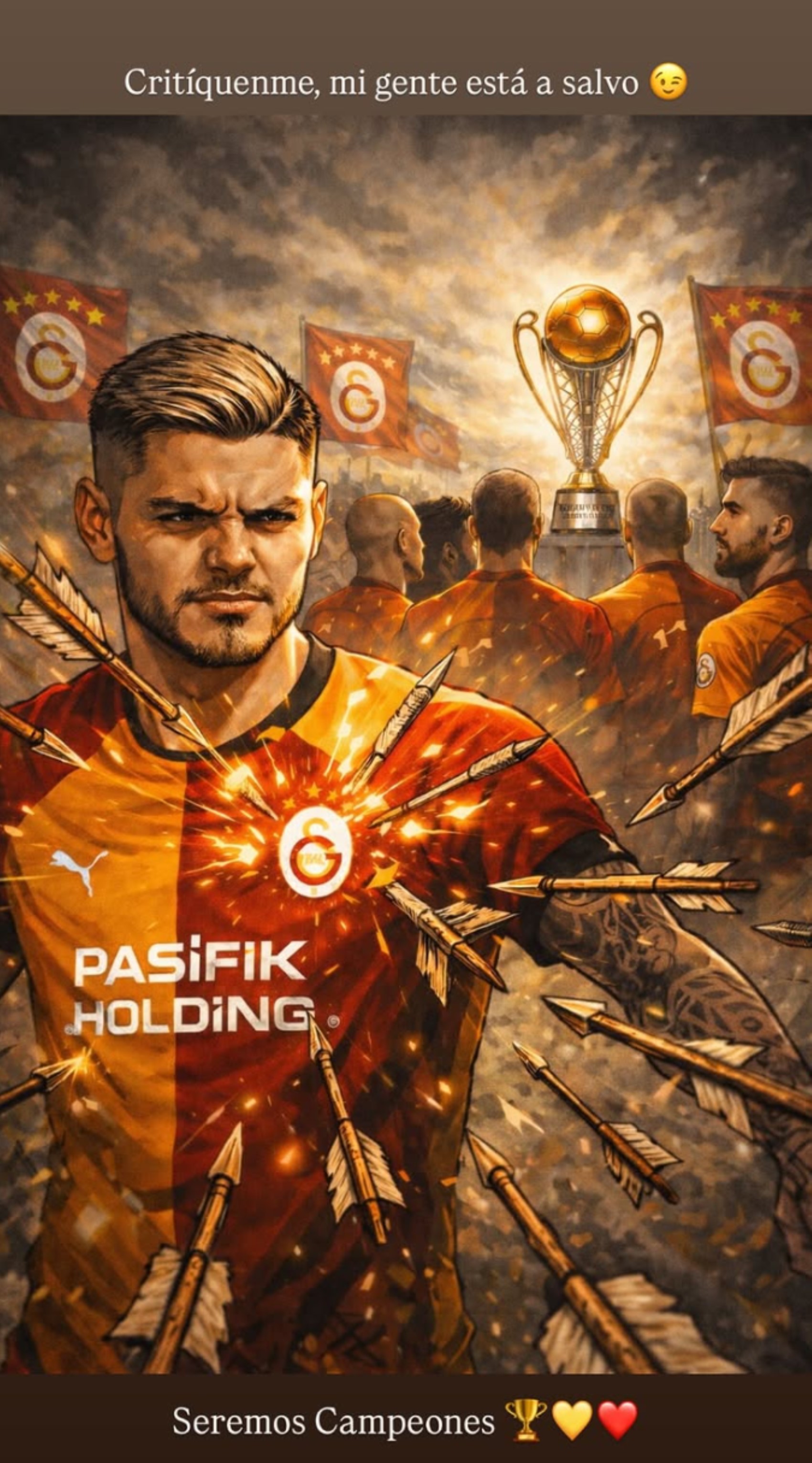 Icardi’nin yayımladığı görselde, takım arkadaşlarının şampiyonluk kupasına doğru ilerlediği, kendisinin ise ön safta yer alarak Galatasaray’a yönelen eleştirilere karşı tek başına durduğu bir kompozisyon yer aldı.