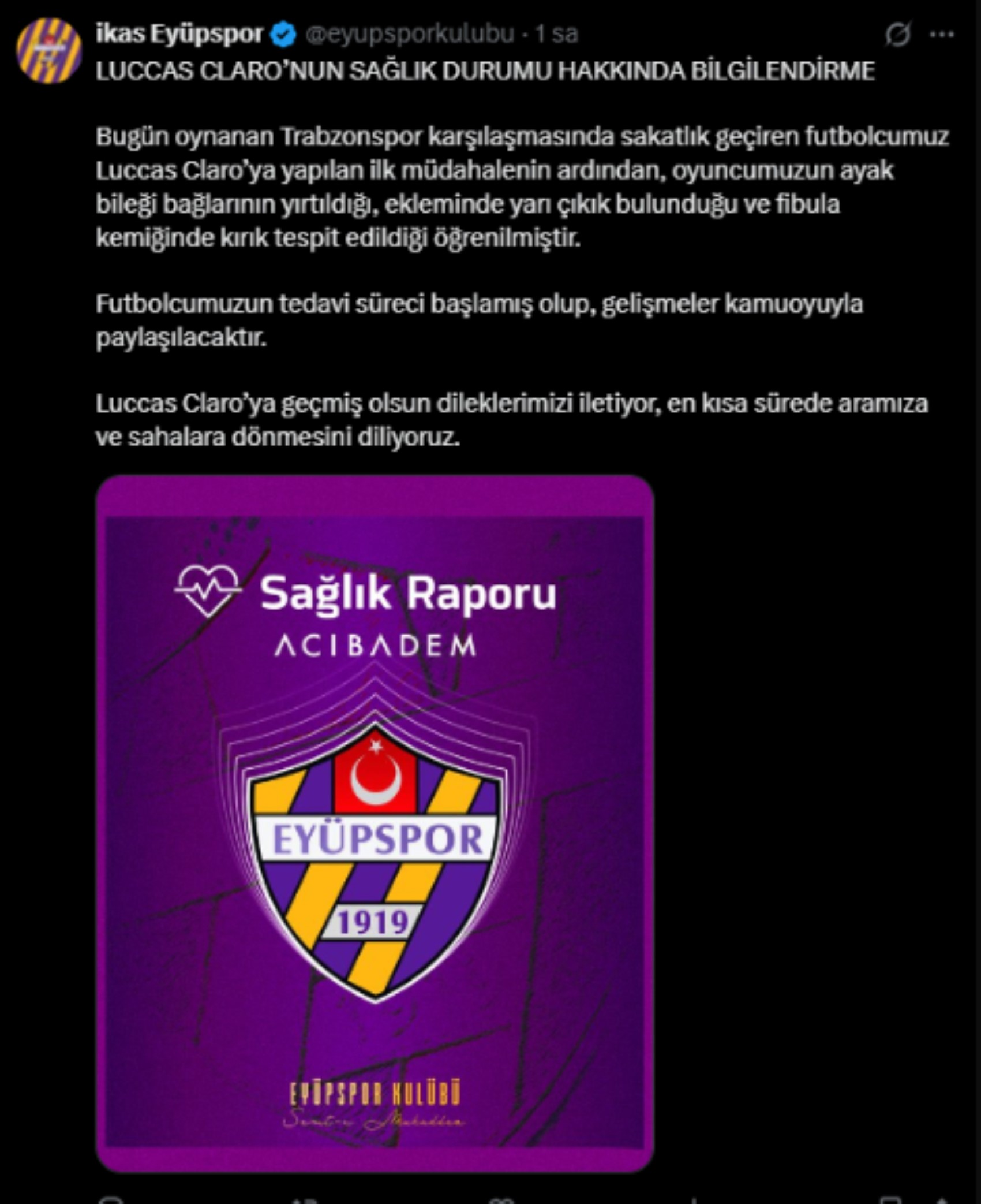 Futbolcumuzun tedavi süreci başlamış olup, gelişmeler kamuoyuyla paylaşılacaktır. Luccas Claro'ya geçmiş olsun dileklerimizi iletiyor, en kısa sürede aramıza ve sahalara dönmesini diliyoruz" ifadeleri kullanıldı.