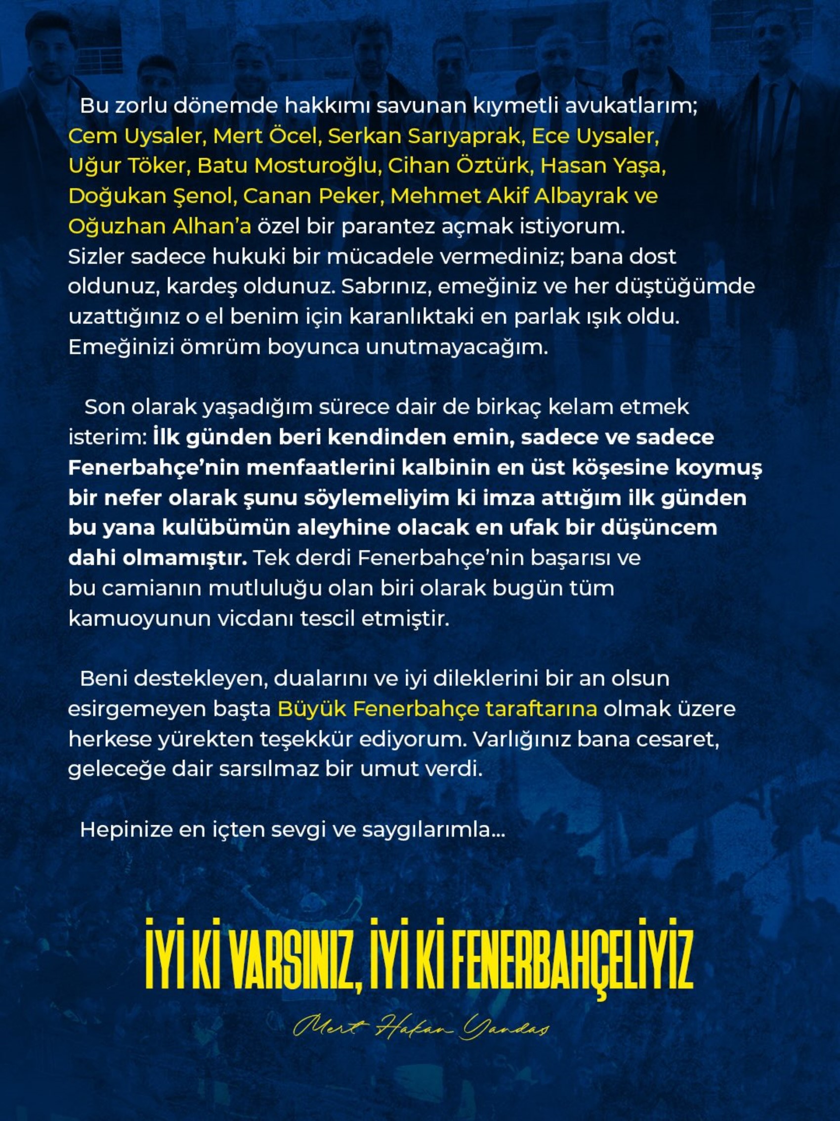 Son olarak yaşadığım sürece dair de birkaç kelam etmek isterim: İlk günden beri kendinden emin, sadece ve sadece Fenerbahçe'nin menfaatlerini kalbinin en üst köşesine koymuş bir nefer olarak şunu söylemeliyim ki imza attığım ilk günden bu yana kulübümün aleyhine olacak en ufak bir düşüncem dahi olmamıştır. Tek derdi Fenerbahçe'nin başarısı ve bu camianın mutluluğu olan biri olarak bugün tüm kamuoyunun vicdanı tescil etmiştir.
