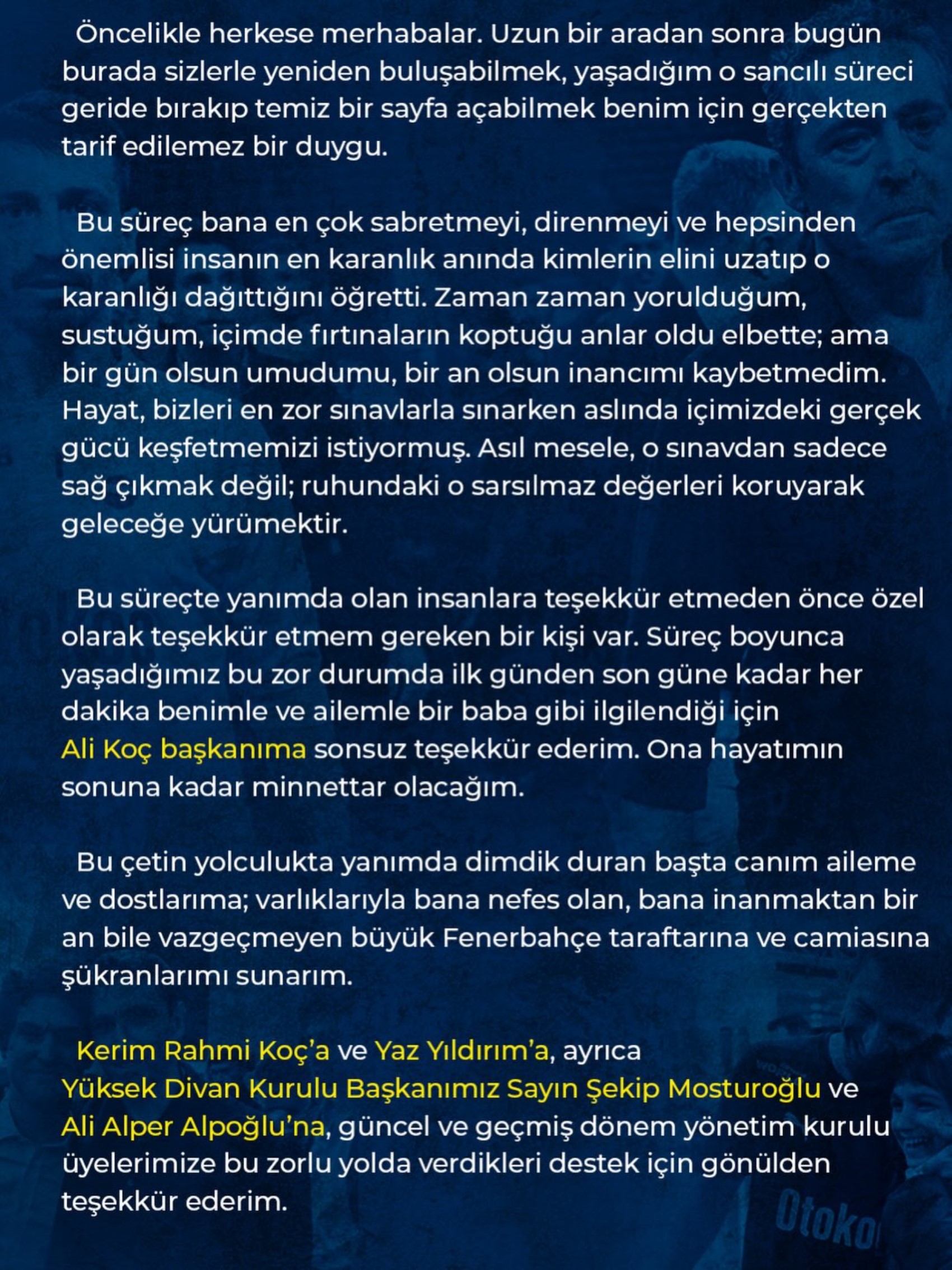 Bu süreçte yanımda olan insanlara teşekkür etmeden önce özel olarak teşekkür etmem gereken bir kişi var. Süreç boyunca yaşadığımız bu zor durumda ilk günden son güne kadar her dakika benimle ve ailemle bir baba gibi ilgilendiği için Ali Koç başkanıma sonsuz teşekkür ederim. Ona hayatımın sonuna kadar minnettar olacağım.