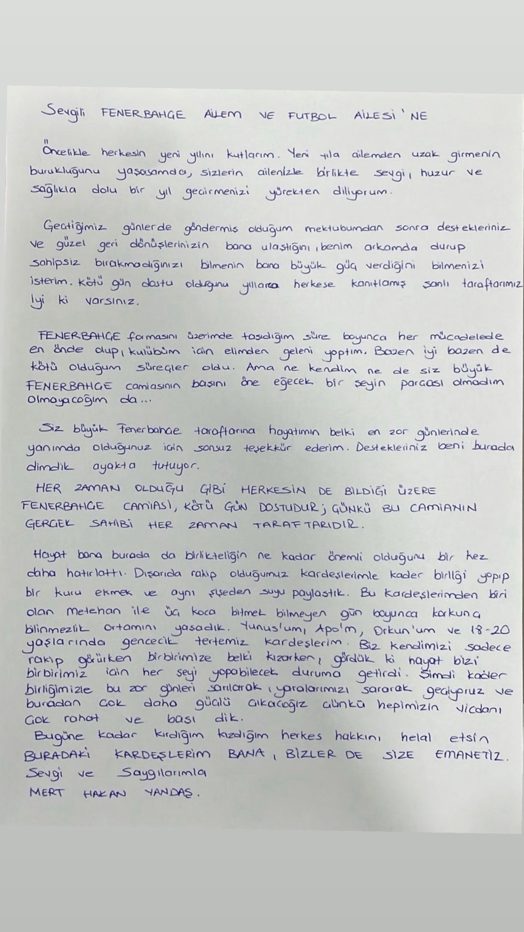 Tutukluluğu devam eden sarı-lacivertlilerin kaptanı Mert Hakan Yandaş, cezaevinden yazdığı bir mektupla Fenerbahçe camiasına yeni yıl mesajı gönderdi.