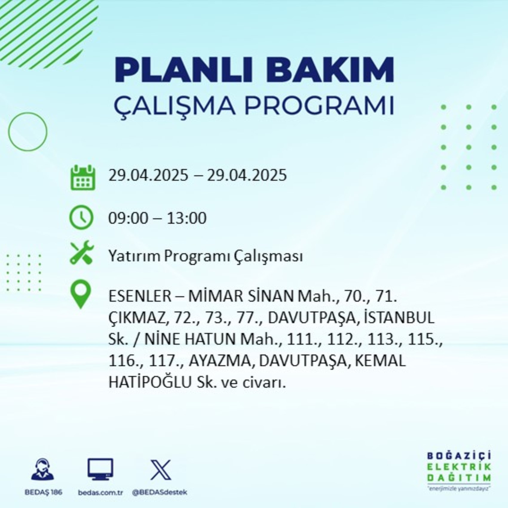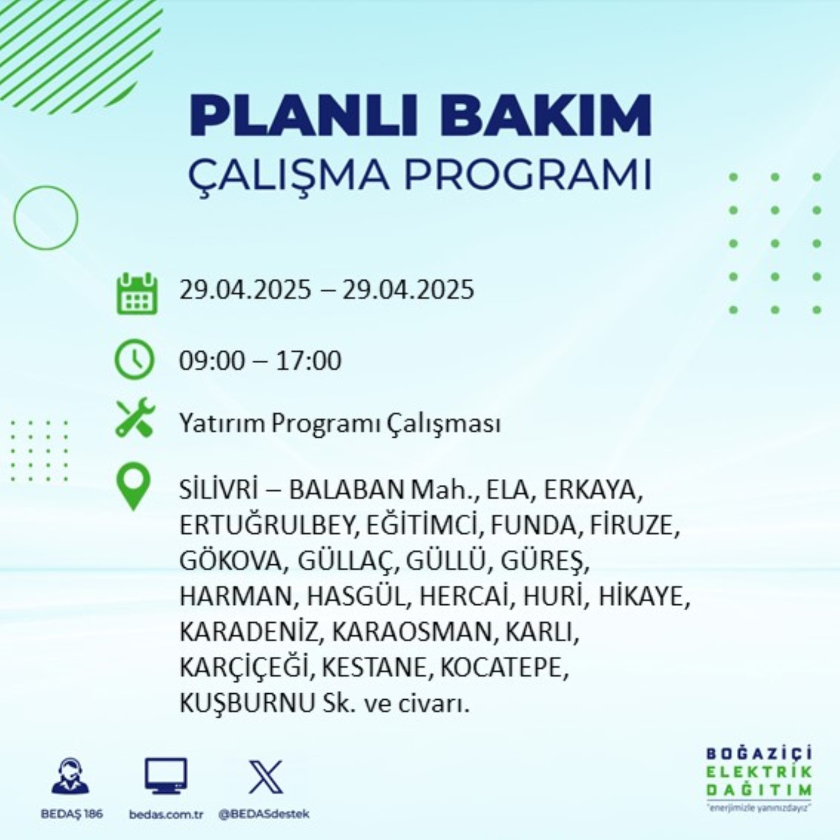 Boğaziçi Elektrik Dağıtım A.Ş. (BEDAŞ), İstanbul'da planlı bakım çalışmaları kapsamında 29 Nisan Salı günü elektrik kesintilerinin yapılacağı ilçe ve mahalleleri internet sitesi üzerinden duyurdu.