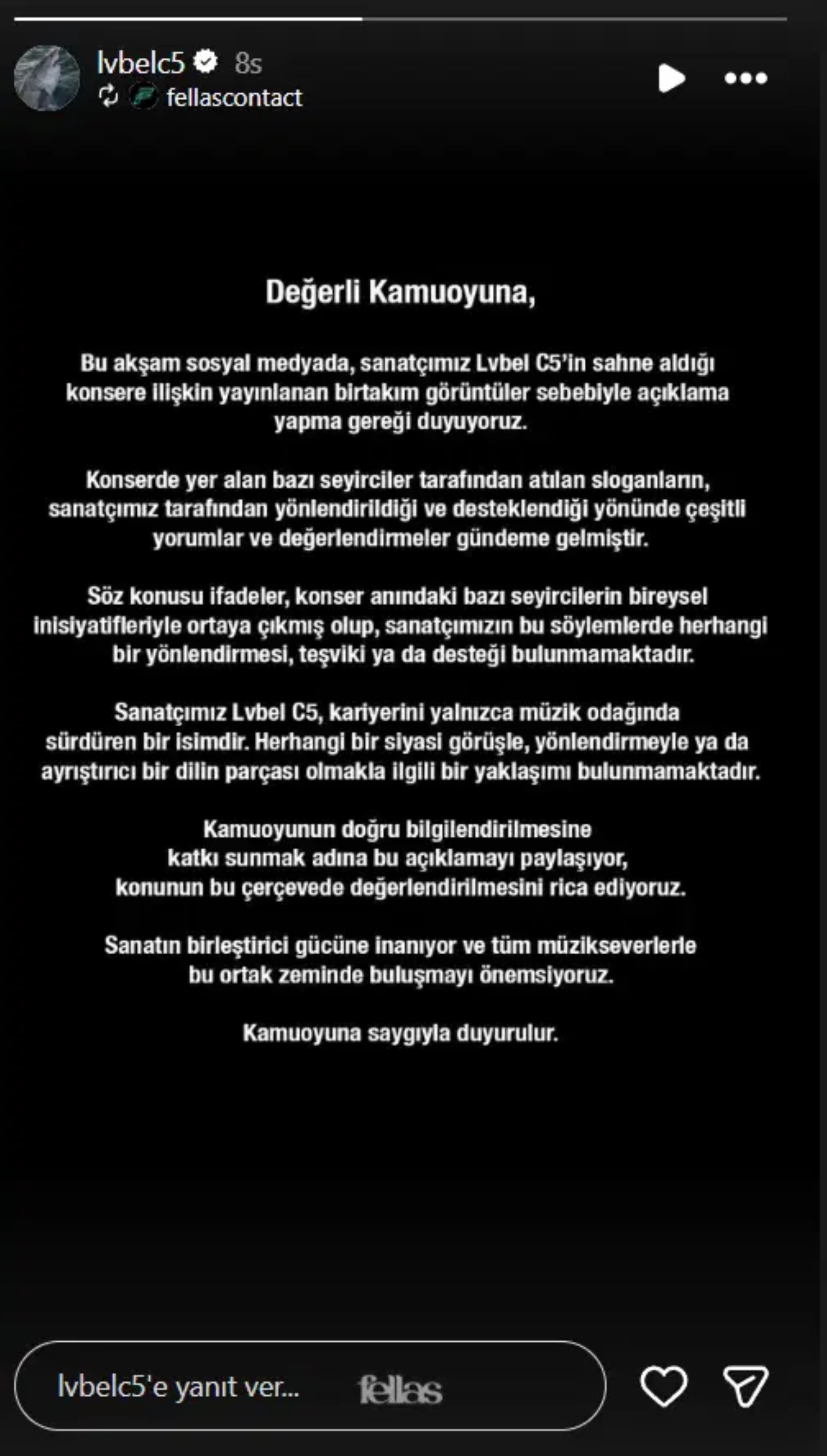 Bu akşam sosyal medyada, sanatçımız Lvbel C5’in sahne aldığı konsere ilişkin yayınlanan birtakım görüntüler sebebiyle açıklama yapma gereği duyuyoruz.