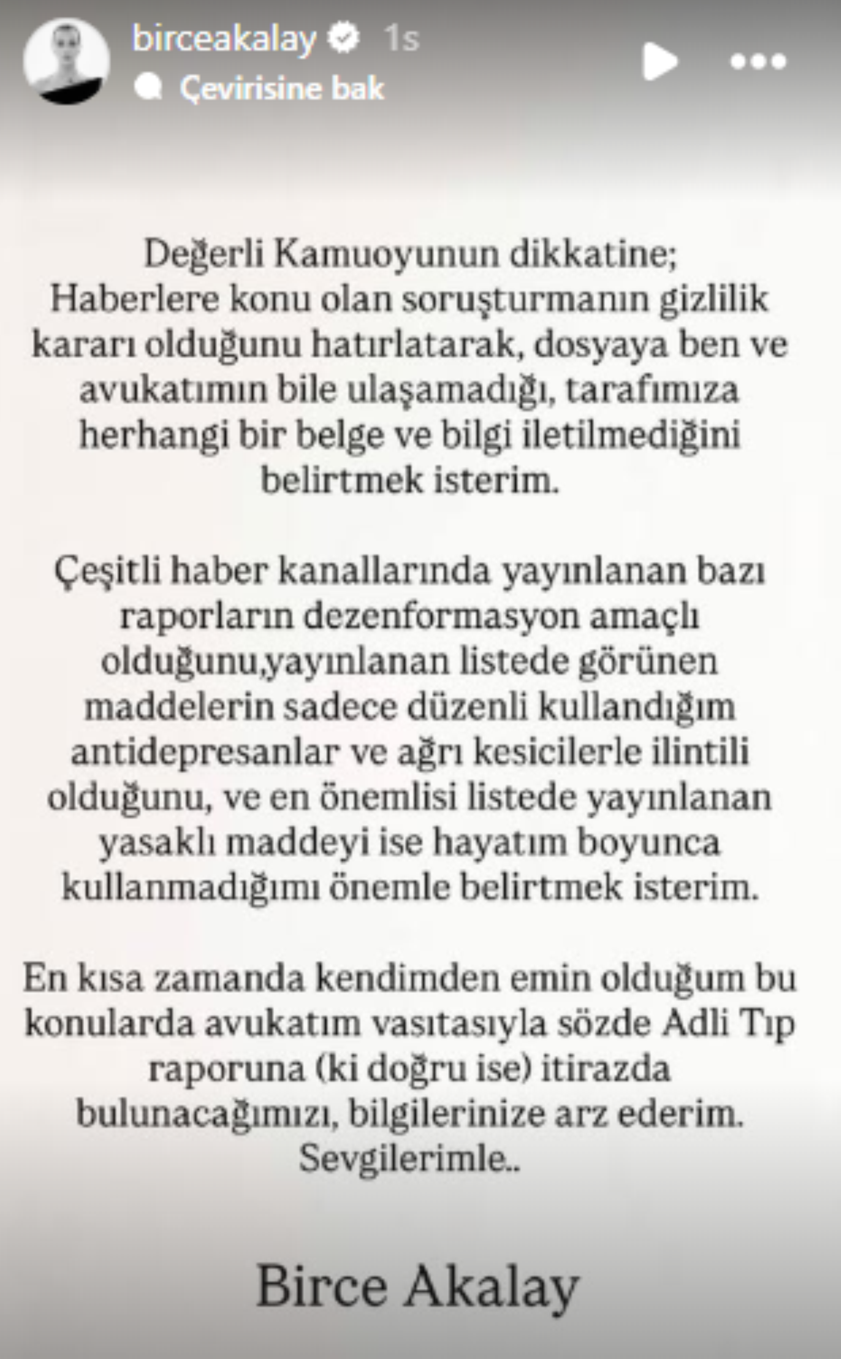 Oyuncu Birce Akalay'ın açıklanan test sonuçlarının ardından uyuşturucu testinin pozitif sonuçlandığı belli olmuştu. Akalay, sosyal medya hesabı üzerinden bu sonuca itiraz edeceğini duyurdu.